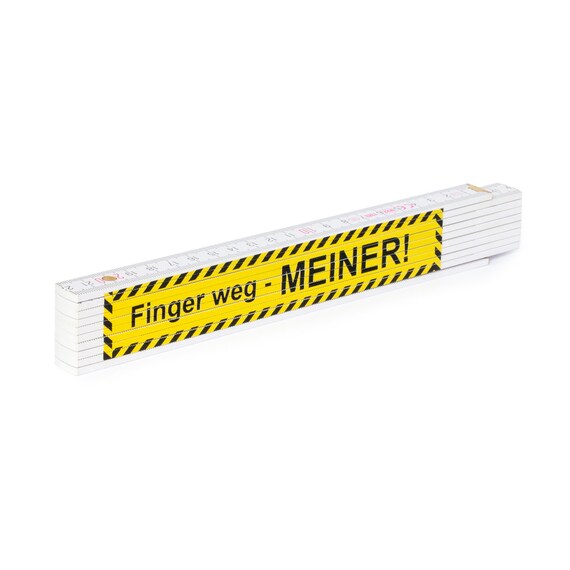 Endlich gehört dein Zollstock nur dir! Dieser coole Zollstock mit dem frechen 'Finger weg'-Aufdruck und deinem persönlichen Namen macht Schluss mit verschwindenden Maßstäben. Einfach deinen Wunschnamen an uns schicken und wir drucken ihn professionell unter 'Eigentum von' auf den Zollstock. Das Besondere: Der Zollstock ist ein deutsches Qualitätsprodukt aus stabilem Buchenholz mit robusten Metallgelenken. Auf beiden Seiten findest du eine Skala und sogar kleine Winkelmesser auf den ersten Gliedern für grobe Winkelmessungen. Der UV-Direktdruck ist extrem langlebig und verblasst nicht - so erkennst du deinen Zollstock auch nach Jahren sofort wieder. Perfekt für Handwerker, Hobby-Heimwerker oder alle, die ihre Werkzeuge lieber behalten statt sie zu verlieren!