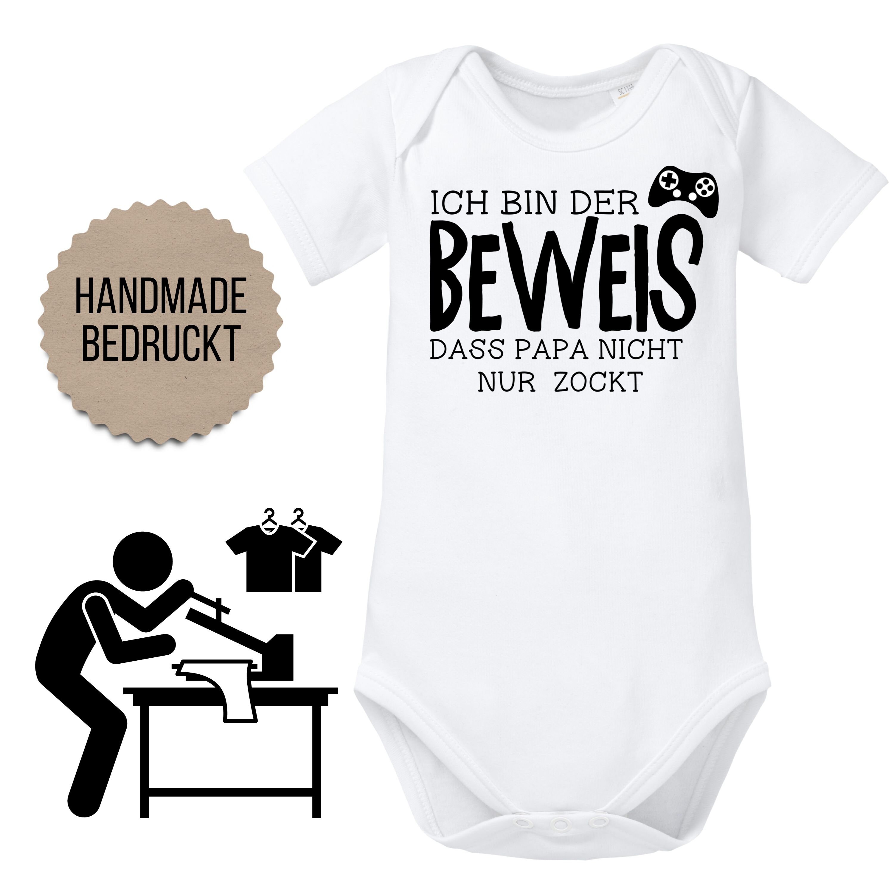 Der perfekte Body für Gamer-Papas! 'Ich bin der Beweis, dass Papa nicht nur zockt' - dieser niedliche Spruch bringt garantiert ein Lächeln ins Gesicht. Aus 100% Bio-Baumwolle, Öko-Tex 100 zertifiziert und komplett in Deutschland produziert. Super weich und hautfreundlich für dein Baby. Der praktische Schlupfkragen macht das An- und Ausziehen zum Kinderspiel. Die nickelfreien Druckknöpfe sind absolut sicher. Perfekt als Geschenk zur Geburt, Taufe oder Babyparty - ein persönliches und lustiges Geschenk, das in Erinnerung bleibt. Für alle stolzen Papas, die zeigen wollen, dass sie mehr können als nur zocken! Nachhaltig produziert, damit dein Baby nur das Beste auf der Haut trägt. Ein einzigartiges Geschenk, das von Herzen kommt und garantiert für Lacher sorgt. Überrasche die frischgebackenen Eltern mit diesem kreativen Babybody!