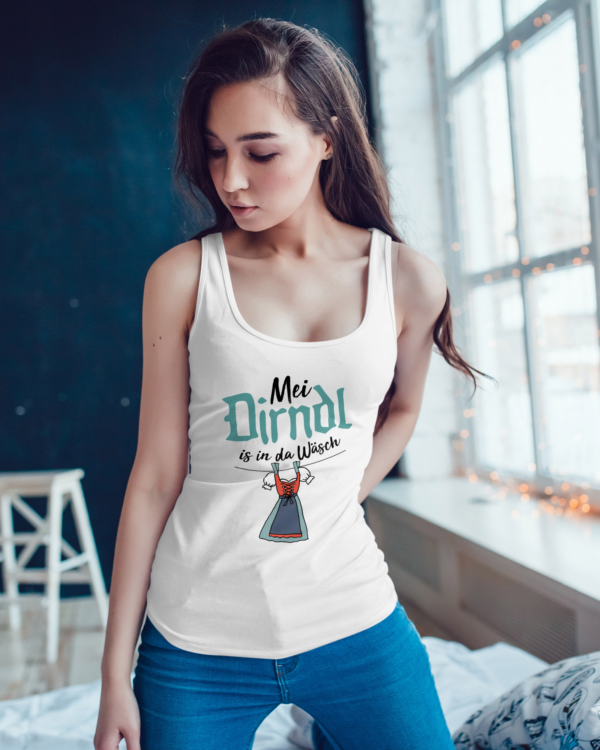 Das perfekte Outfit wenn's Dirndl in der Wäsche ist! Dieses lustige Trachtenshirt mit dem Spruch 'Mei Dirndl is in da Wäsch' und süßen Hirsch- und Blumen-Motiven. Als Tank Top, leicht und bequem zu tragen. Doppelt genähte Säume für Langlebigkeit. Ideal für Oktoberfest, Wiesn, Volksfeste oder bayrische Partys. Super Alternative zum Dirndl - lässig, witzig und total authentisch. In verschiedenen Größen für Damen und Frauen. Mach dich bereit für den Biergarten - auch ohne Dirndl!