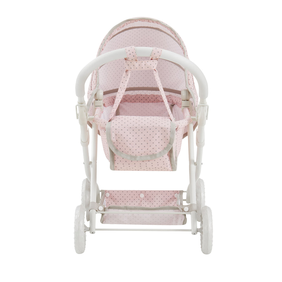 Was für ein niedlicher Puppenwagen! In rosa-grau gepunktetem Design mit praktischem Klappverdeck gegen Sonne und Regen. Super viel Stauraum unten im Korb und einer extra Windeltasche für all das Puppenzubehör. Der cremefarbene Eisenrahmen ist mega stabil und der Sitz waschbar. Einfach zusammenzuklappen und zu verstauen. Für Kinder ab 3 Jahren und absolut sicherheitsgeprüft. Deine Kleine wird ihn lieben - genau wie die Großen!