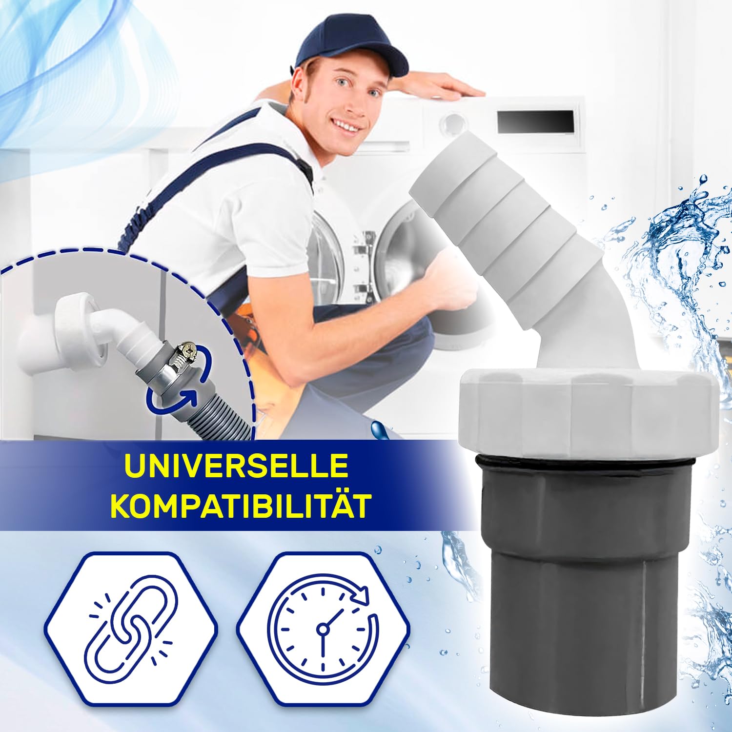 Endlich keine lästigen Wasserrückstände mehr! Dieser universelle Abfluss-Adapter ist die perfekte Lösung für deine Haushaltsgeräte wie Waschmaschine, Geschirrspüler oder Trockner. Mit dem cleveren 45° Winkel-Design fließt das Wasser optimal ab und verhindert zuverlässig Rückstau und unangenehme Gerüche durch stehendes Wasser.\\n\\nDer Adapter passt perfekt zu Standard-40mm Abläufen und hat einen anpassbaren Eingangsstutzen von 19-24mm - damit ist er mit den meisten deutschen Haushaltsgeräten kompatibel. Die Installation ist denkbar einfach: Einfach den richtigen Durchmesser deines Siphons messen, Adapter aufstecken und mit der beiliegenden Edelstahl-Schlauchschelle fixieren. Werkzeug benötigst du dafür kein einziges!\\n\\nHergestellt aus hochwertigem ABS-Kunststoff, der extrem stabil, langlebig und beständig gegen Reinigungsmittel und Korrosion ist. Selbst bei hohen Temperaturen verformt sich das Material nicht. Der mitgelieferte Dichtungsring sorgt für absolute Dichtheit - keine lästigen Tropfen oder Undichtigkeiten mehr.\\n\\nLieferumfang: 1x Abflussadapter aus ABS-Kunststoff plus 1x rostfreie Edelstahl-Schlauchschelle. Mit diesem Adapter machst du deine Haushaltsgeräte in wenigen Minuten betriebsbereit und sorgst für einen reibungslosen Wasserablauf. Einfache Lösung für ein häufiges Problem in deutschen Haushalten!