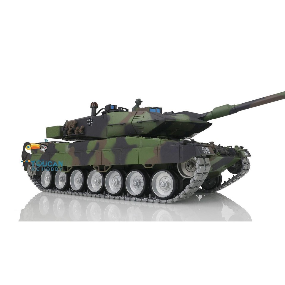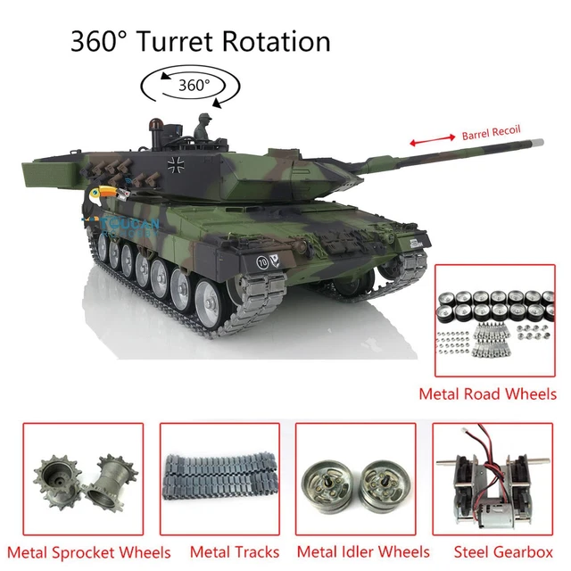 Abenteuer im Miniaturformat! Dieser ferngesteuerte Leopard 2A6 Panzer im Maßstab 1:16 begeistert mit realistischen Funktionen. Mit Metallketten, Metallrädern und Stahlgetrieben für maximale Haltbarkeit. Das Infrarot-Kampfsystem ermöglicht spannende Gefechte mit anderen Panzern - ohne Einschränkungen durch die 2,4 GHz Fernsteuerung. Der Turnt dreht sich 360° und das Rohr bewegt sich um 30° nach oben/unten. Mit Rauchgenerator, Soundeffekten und LED-Beleuchtung für ultimative Realität. Schießt 6mm BB-Pellets bis 20m Entfernung. Komplettset inklusive Akku, Ladegerät und allem Zubehör - sofort startklar für actionreiche Panzerduelle!