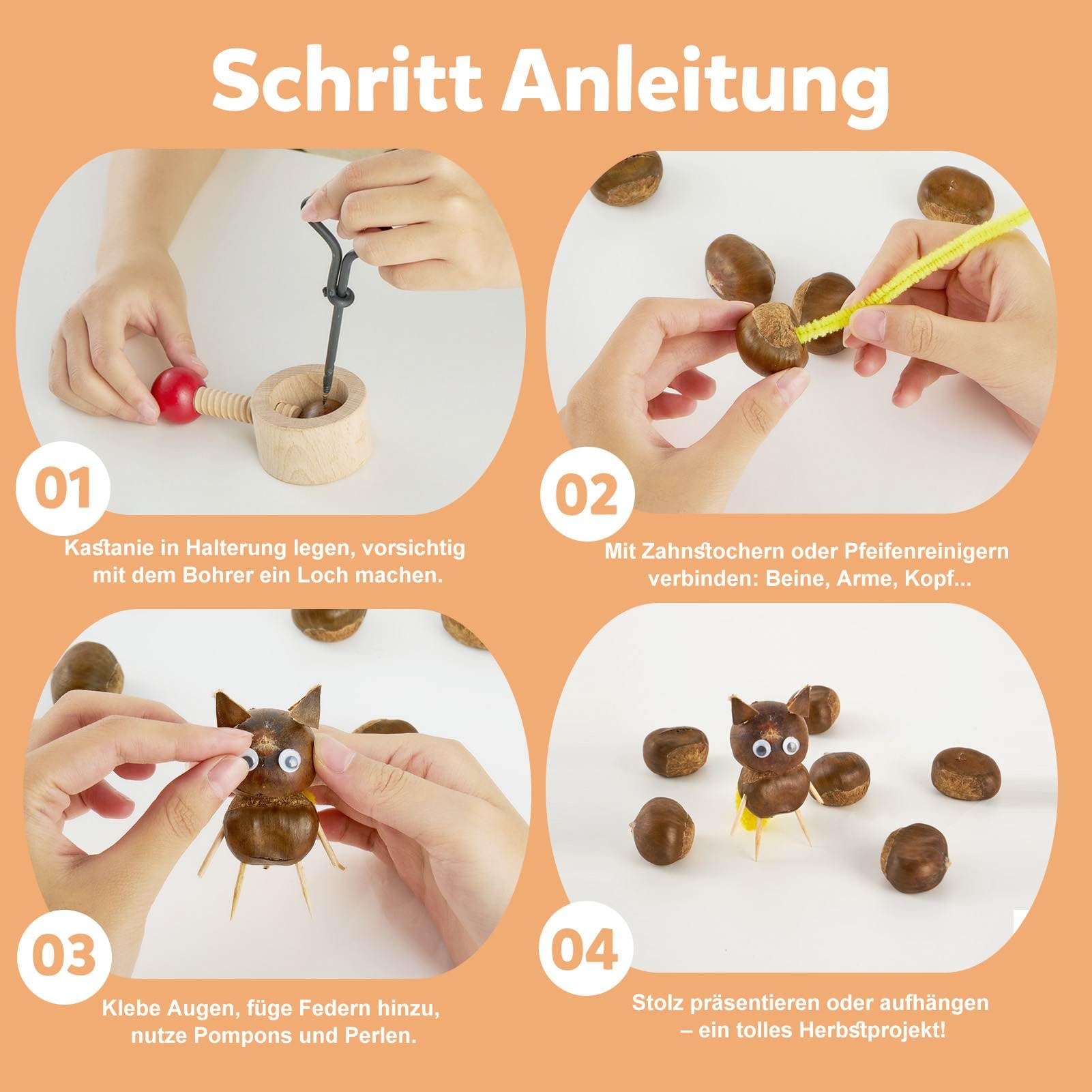 Herbstzeit ist Bastelzeit! Dieses Kastanienbohrer-Set von InemzTal bringt Spaß für die ganze Familie. Enthält 5 Handbohrer in verschiedenen Größen: 1,5mm, 2mm, 3mm, 4mm und 5mm - für alle Bastel-Projekte. Mit praktischem Kastanienhalter - sicher und einfach zu handhaben. Aus speziellem Edelstahl - super stabil und langlebig. Perfekt für Kastanien, Eicheln, Walnüsse - alles, was der Herbst so hergibt! Bastle niedliche Kastanienmännchen, Tiere oder fantasievolle Kreationen. Tolle Beschäftigung für regnerische Herbsttage. Achtung: Enthält Kleinteile, nicht für Kinder unter 3 Jahren! Mach den Herbst bunt und kreativ - sammeln, bohren, basteln!