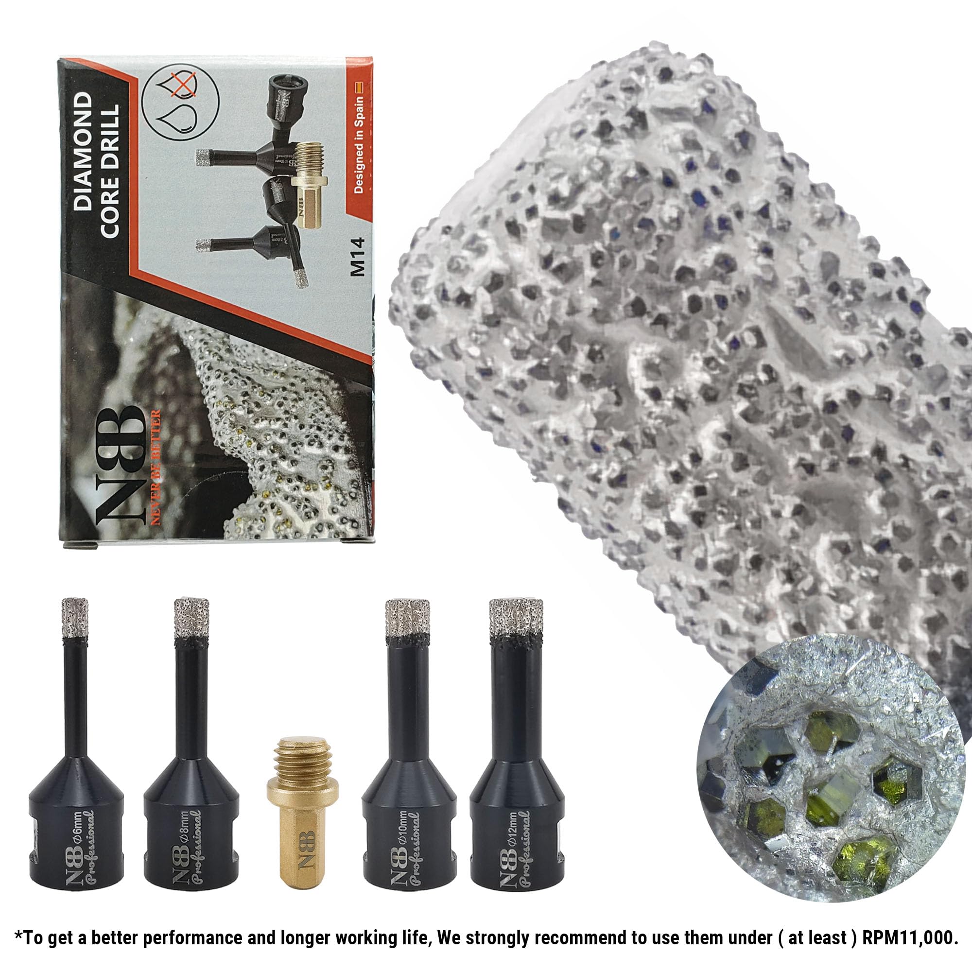 Professionelle NBB Diamantbohrer für harte Materialien! Perfekt für Porzellan, Keramik, Fliesen, Granit und Marmor. Mit Vakuum-Löttechnologie für langlebige Diamantbeschichtung. Sechskantschaft passt in Akku- und kabelgebundene Bohrmaschinen. Kann trocken oder nass gebohrt werden - für Nassbohren natürlich langlebiger. Empfohlene Drehzahl: 2.000-3.000 U/min, kein Hämmern! 1,6 mm Durchmesser, Gesamtlänge ca. 68 mm. Mit speziellem Kaltwachs im Inneren für besseres Trockenbohren. Einfache Handhabung für Heimwerker und Profis. Für Wasseranschlüsse, Steckdosen und andere Installationen in harten Materialien.