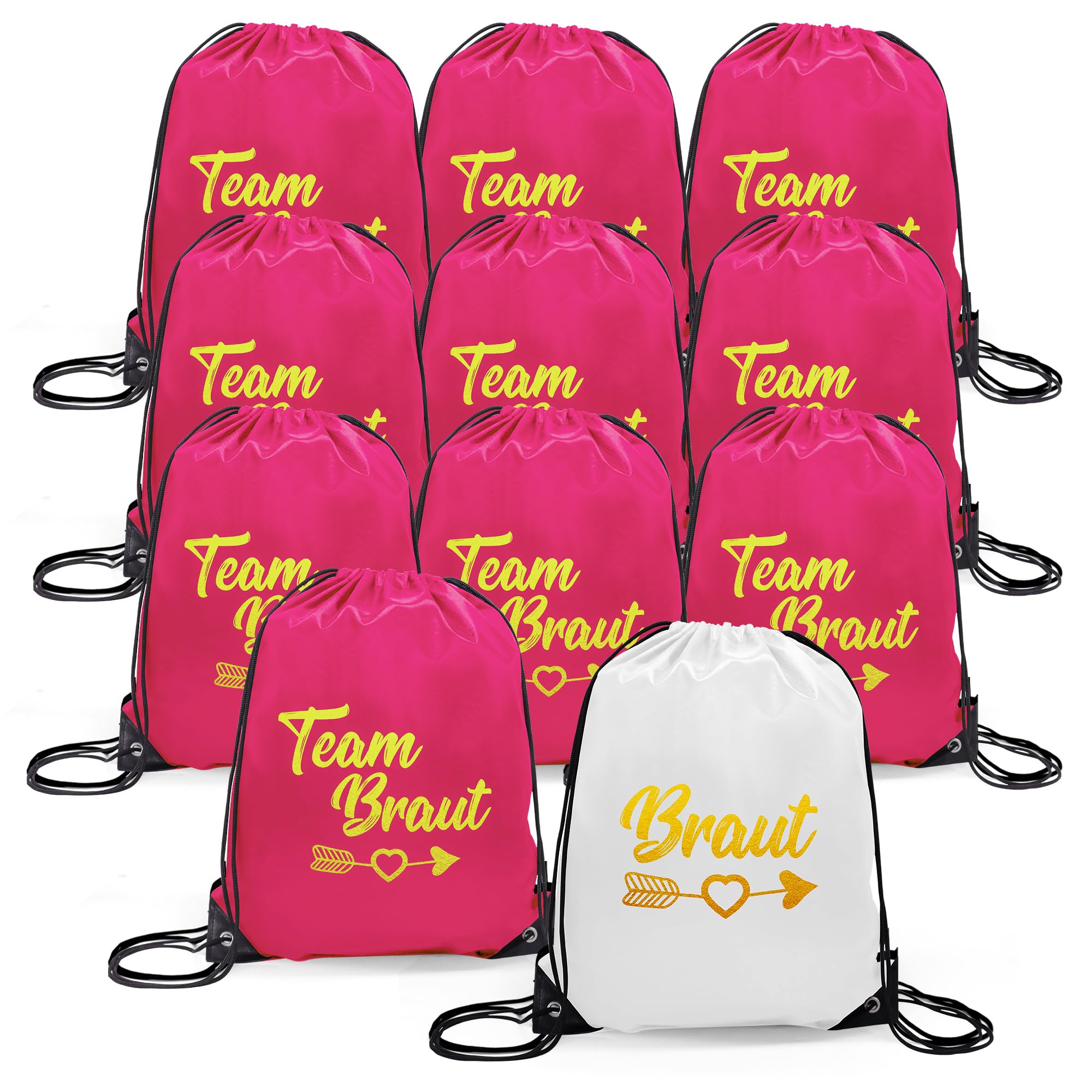 Hey Brautgruppe - macht euch bereit für den ultimativen Junggesellenabschied! Dieses komplett Set hat alles, was ihr für einen unvergesslichen Tag braucht. Enthalten sind 10 Turnbeutel - einer in Weiß für die Braut und neun in Schwarz für das Team. Dazu passende Armbänder und sogar ein Aufkleber! Die Beutel aus robustem Oxford-Stoff sind 42x33 cm groß und haben praktische Kordelzüge. Darin findet alles Platz: Schleier, Make-up, Snacks oder was auch immer ihr für euren großen Tag benötigt. Die Armbänder sind verstellbar und passen an jedes Handgelenk. Mit den Aufschriften 'Braut' und 'Team Braut' zeigt jeder sofort, wer dazu gehört. Perfekt koordinierte Gruppe, perfekte Fotos, perfekte Stimmung! Nach der Party können die Beutel weiter als Einkaufstaschen oder für Sport verwendet werden. Ob für den JGA, die Hochzeit oder andere Feiern - dieses Set macht jede Brautgruppe zum Highlight!