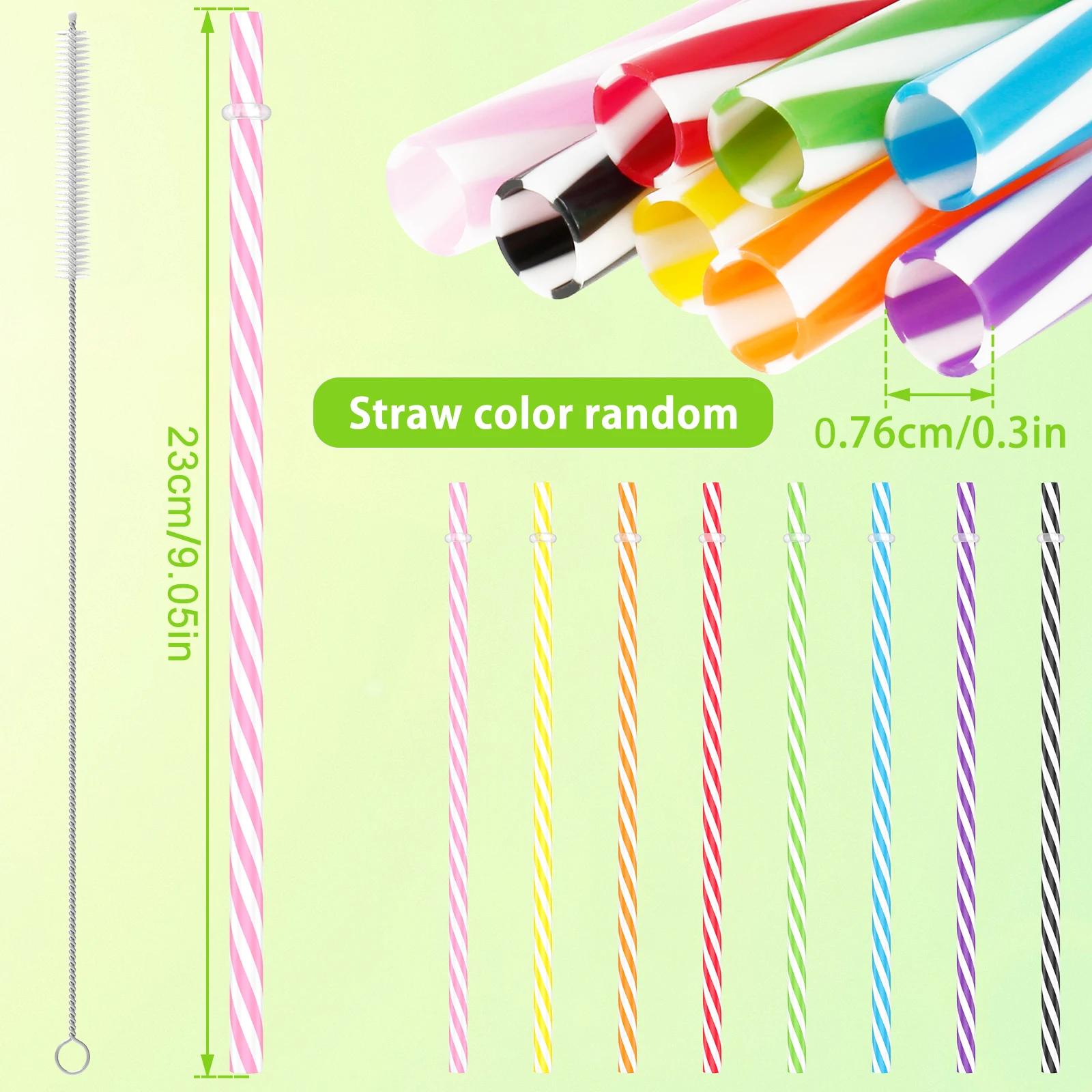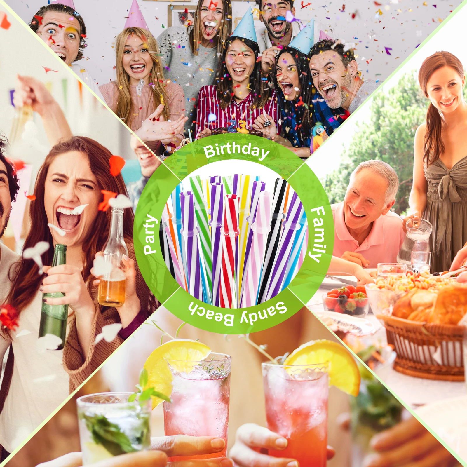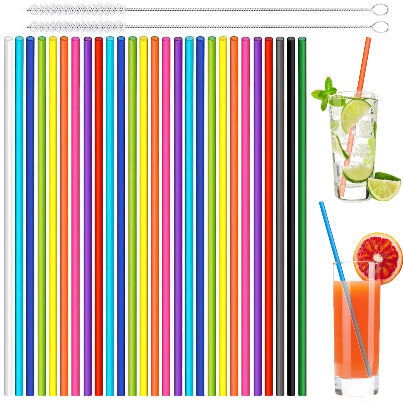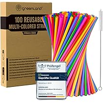Schluss mit Einweg-Plastik! Diese 100 wiederverwendbaren Strohhalme sind nicht nur umweltfreundlich, sondern auch super stabil und praktisch. Mit 24cm Länge und 7mm Durchmesser passen sie perfekt zu Cocktails, Smoothies, Milchshakes - und sogar zu heißen Getränken! \\n\\nDas Besondere: Die Strohhalme sind aus hochwertigem PP-Material, BPA-frei und geschmacksneutral. Sie weichen nicht auf und behalten ihre Form - egal ob in kalten oder warmen Getränken. \\n\\nDie 7 fröhlichen Farben (Schwarz, Rot, Rosa, Blau, Gelb, Grün, Lila) machen jede Party bunter. Und mit der beiliegenden Reinigungsbürste wird die Säuberung zum Kinderspiel. \\n\\nOb für die nächste Gartenparty, Kindergeburtstage, die Hausbar oder den Camping-Ausflug - diese Strohhalme sind immer eine gute Wahl. Sie sind bruchfest, knickstabil und sehen mit ihren dekorativen Streifen einfach stylisch aus. \\n\\nEinmal kaufen, immer wieder verwenden - so einfach kann Umweltschutz sein! Das komplette Set wiegt nur 300g und ist damit perfekt für unterwegs. Mach deine Getränke zum Eyecatcher und tu gleichzeitig etwas Gutes für die Umwelt!
