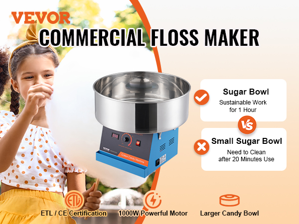 Wow, damit machst du jede Party zum Hit! Diese professionelle Zuckerwattemaschine von VEVOR produziert bis zu 6 Zuckerwatten pro Minute - ideal für Kindergeburtstage, Straßenfeste oder einfach mal was Besonderes für die Familie.\\n\\nMit 1000W Motorpower und der großen Edelstahl-Schüssel klappt alles ratzfatz. Du kannst die Temperatur von 118°C bis 226°C genau einstellen - perfekt für verschiedene Zuckerarten. Sogar bunte Zuckerwatten mit verschiedenen Geschmacksrichtungen sind möglich!\\n\\nDie Maschine kann eine Stunde durchlaufen ohne heiß zu werden. Praktisch: Die integrierte Schublade bietet Stauraum für Stäbchen und Zucker. Alles aus lebensmittelechtem Edelstahl - also einfach zu reinigen und hygienisch.\\n\\nOb für den Schulbasar, Weihnachtsmarkt oder Geburtstagsfeier - mit dieser Maschine bist du der Star jeder Veranstaltung! Einfach einschalten, Zucker rein und nach 2-3 Minuten Warmlaufen kannst du schon die erste Zuckerwatte drehen.