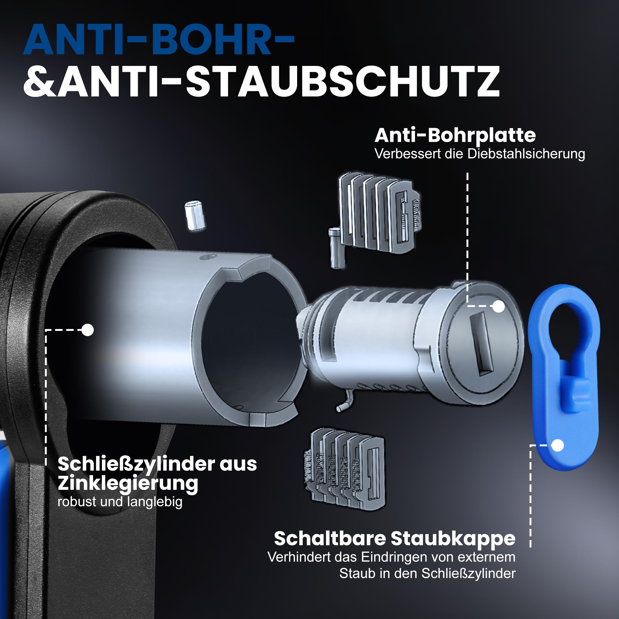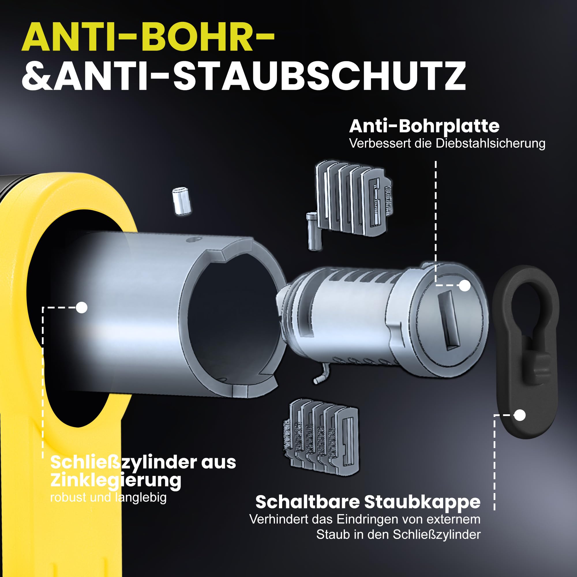 Die 4mm dicken Stahlplatten sind mit ABS beschichtet - extrem schnittfest und kratzen nicht den Fahrradrahmen. Der Schließzylinder aus Zinklegierung ist bohrsicher und korrosionsbeständig.