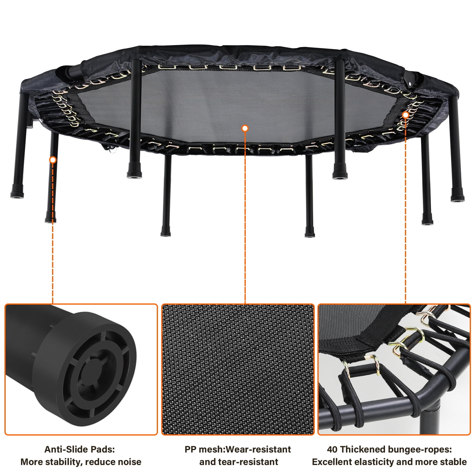 Spring dich fit und glücklich! Dieses Gielmiy Fitness-Trampolin mit 101cm Sprungfläche ist dein perfekter Trainingspartner für zu Hause. Die 30 Bungee-Seile statt lauter Metallfedern sorgen für ein gelenkschonendes und super leises Workout - deine Nachbarn werden's dir danken! Der stabile Schwermetall-Rahmen hält bis zu 150kg aus, und die 6 rutschfesten Gummi-Füße geben sicheren Halt. 10 Minuten Springen ersetzen eine ganze Stunde Joggen - effektiver geht's kaum! Perfekt für Cardio-Training, Fettverbrennung und um einfach mal Dampf abzulassen. Ob drinnen oder im Garten, alleine oder mit der Familie - hier kommt garantiert gute Laune auf. Der Aufbau braucht etwas Muskelkraft, aber das Ergebnis lohnt sich. Also, worauf wartest du? Ab aufs Trampolin und losgesprungen!