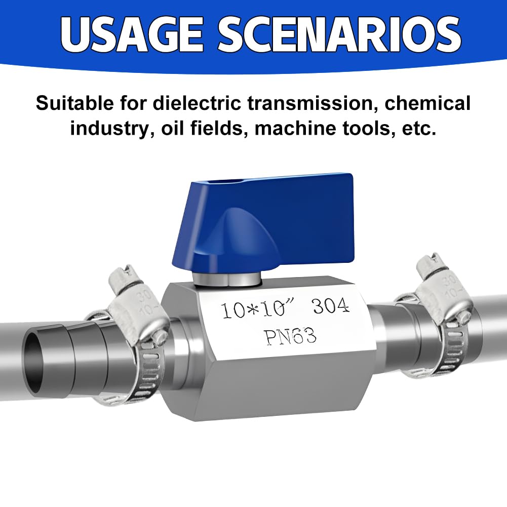 Also, wenn du nen zuverlässigen kleinen Kugelhahn suchst, der was aushält, dann guck dir mal dieses Teil an! Aus Edelstahl 304 gemacht - das bedeutet: Der rostet nicht und hält auch aggressive Medien aus.\\n\\nDer Durchmesser ist 10 mm, also perfekt für kleinere Rohr- und Schlauchsysteme. Mit den Pagodenanschlüssen kriegst du den ganz einfach dran, ohne dass du irgendwelche Spezialwerkzeuge brauchst. Und die beiden Schlauchschellen sind gleich mit dabei - praktisch, oder?\\n\\nWas ich mega finde: Der blaue Isoliergriff. Der lässt sich super easy um 90 Grad drehen, und schon ist das Ventil zu oder auf. Super präzise kannst du damit den Durchfluss regulieren. Und weil der Ventilkörper extra verdickt ist, platzt der nicht so schnell. Sicherheit geht vor!\\n\\nOb in der Wasserversorgung, für Gas, Kraftstoff oder Bewässerungssysteme - dieser Mini-Absperrhahn macht überall ne gute Figur. Sogar in Autos und Schiffen wird das Teil eingesetzt. Also wirklich ein Allrounder!\\n\\nKleiner Hinweis: Schau vor dem Kauf lieber nochmal nach, ob 10 mm auch wirklich deine Größe ist. Aber wenn ja - dann zugreifen! Qualität made in Germany muss nicht immer teuer sein.