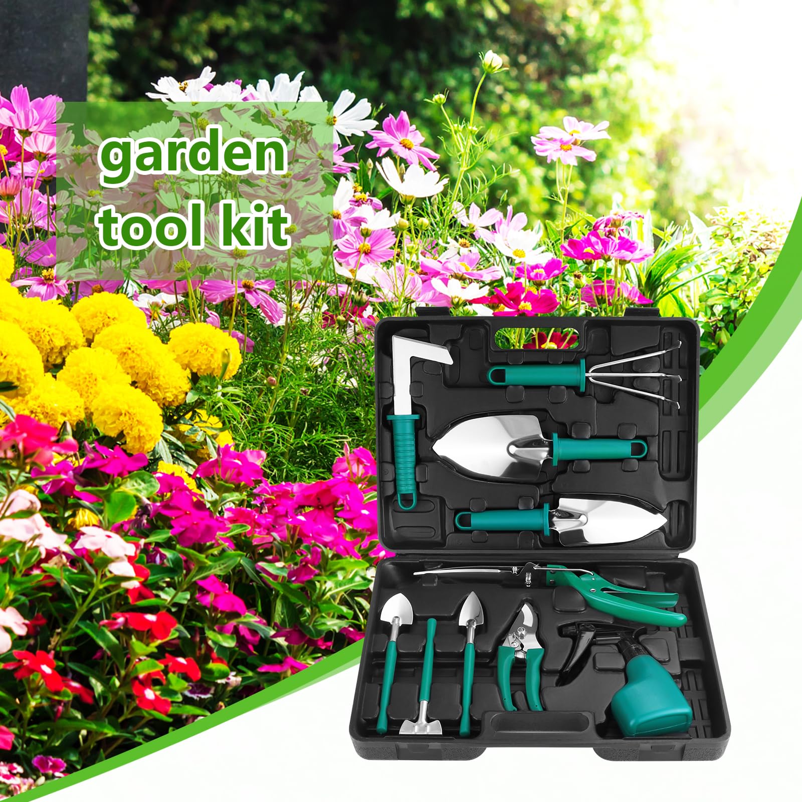 Perfekt ausgestattet für deinen Garten! Dieses 11-teilige Gartenwerkzeug-Set von MQFORU enthält alles, was du für die Gartenarbeit brauchst. Dabei sind Gartenschere, Kelle, Harke, Gabel, Unkrautstecher, Handschuhe und sogar ein Sprühgerät.