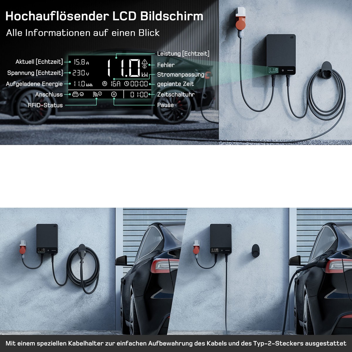 Lade dein E-Auto jetzt richtig schnell und smart mit dieser FULLWATT Wallbox! Mit 11 kW Ladeleistung und 3-Phasen-Technologie ist sie deutlich schneller als eine normale Haushaltssteckdose. Das 7 Meter lange Typ-2-Kabel gibt dir genug Reichweite, auch bei ungünstigen Parkpositionen. Über die App steuerst du das Laden bequem aus der Ferne, planst Ladezeiten und passt den Strom an - so sparst du bares Geld. Oder du nutzt die RFID-Karte für sichere Authentifizierung. Das große 4,3-Zoll-Display zeigt dir alle wichtigen Daten auf einen Blick. Mit IP54-Schutz ist die Wallbox wetterfest und kann auch draußen installiert werden. Integrierte Sicherheitsfeatures wie FI-Schutz, Überstromschutz und Temperaturüberwachung geben dir zusätzliche Sicherheit. Einfach installieren und schon kannst du dein E-Auto bequem daheim laden - ob in der Garage, Carport oder Firmenparkplatz!