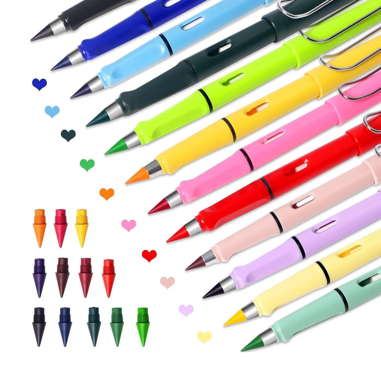 Das coolste Stifte-Set ever! 12 bunte Zauberstifte, die nie gespitzt werden müssen - einfach die Spitze wechseln und schon hast du eine neue Farbe! Enthält 12 Stifte in knalligen Farben plus 12 Ersatzspitzen. Mit integriertem Radiergummi für schnelles Korrigieren. Die ergonomischen Stifte liegen super in der Hand und brechen nicht ab. Das süße Kawaii Federmäppchen dient als Stifthalter oder tragbares Etui - einfach praktisch! Perfekt für Schule, Büro, Kreativprojekte oder unterwegs. Ein ideales Geschenk für Kinder und Erwachsene, die was Besonderes suchen. Macht das Malen und Schreiben zum puren Vergnügen - ohne lästiges Anspitzen! Hol dir dieses geniale Set und sei kreativ!