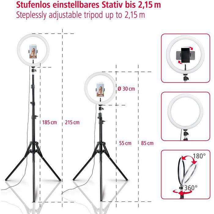 Perfektes Licht für deine Social Media Auftritte! Dieses LED Ringlicht mit 12 Zoll Durchmesser macht dich zum Star auf YouTube, TikTok und Instagram. Mit 160 LEDs und einstellbarer Farbtemperatur (3000K/4000K/6500K) plus 10 Helligkeitsstufen findest du immer die perfekte Einstellung. Das Stativ geht bis 215cm hoch - ideal für Steh- und Sitzaufnahmen. Der flexible Schwanenhals mit Handyhalter bringt deine Kamera genau in Position. USB-betrieben, also überall einsetzbar! Inklusive Bluetooth-Fernauslöser für bequeme Selfies. Ob für Livestreams, Videos oder Videokonferenzen - mit diesem Ringlicht siehst du immer top aus! Einfach aufbauen und sofort professionell wirken. Dein neues Must-Have für alle Content Creator!