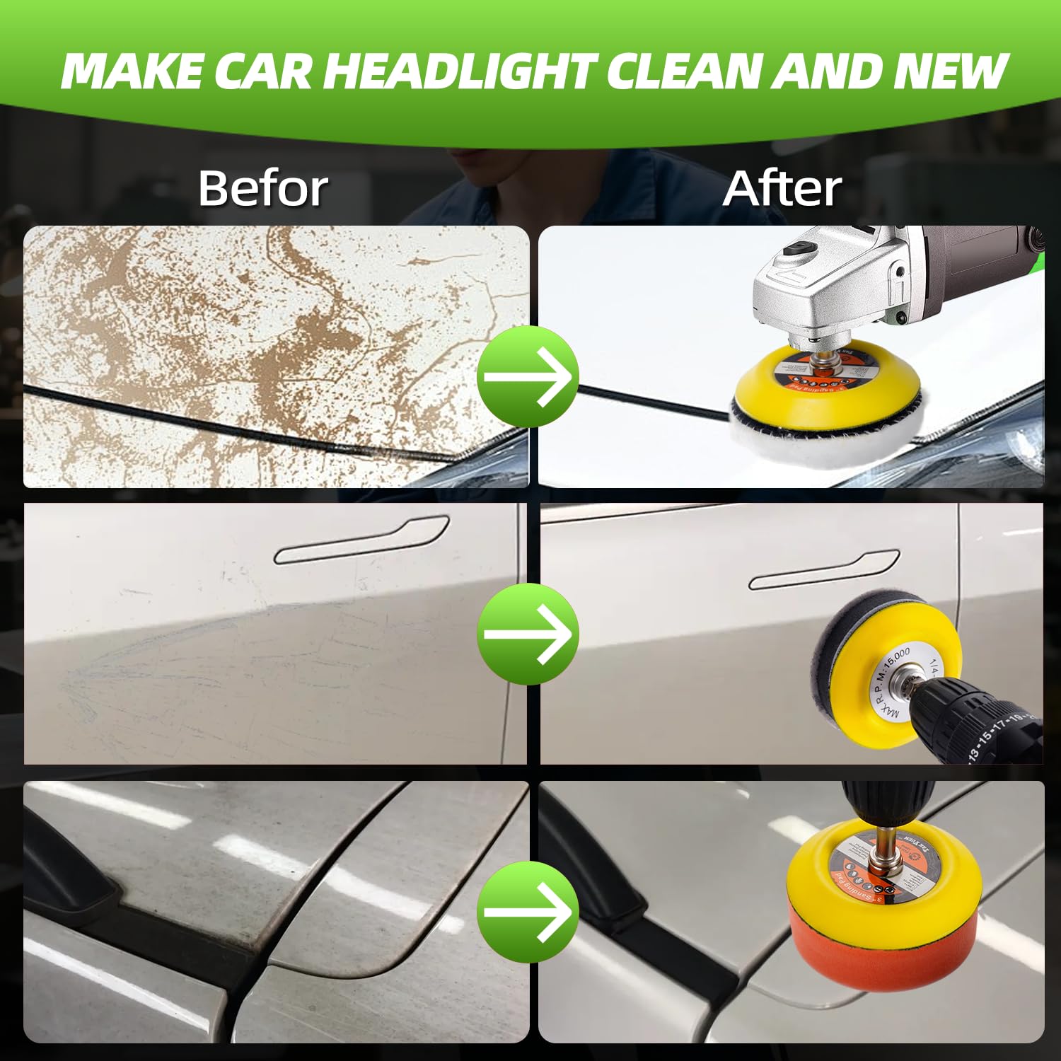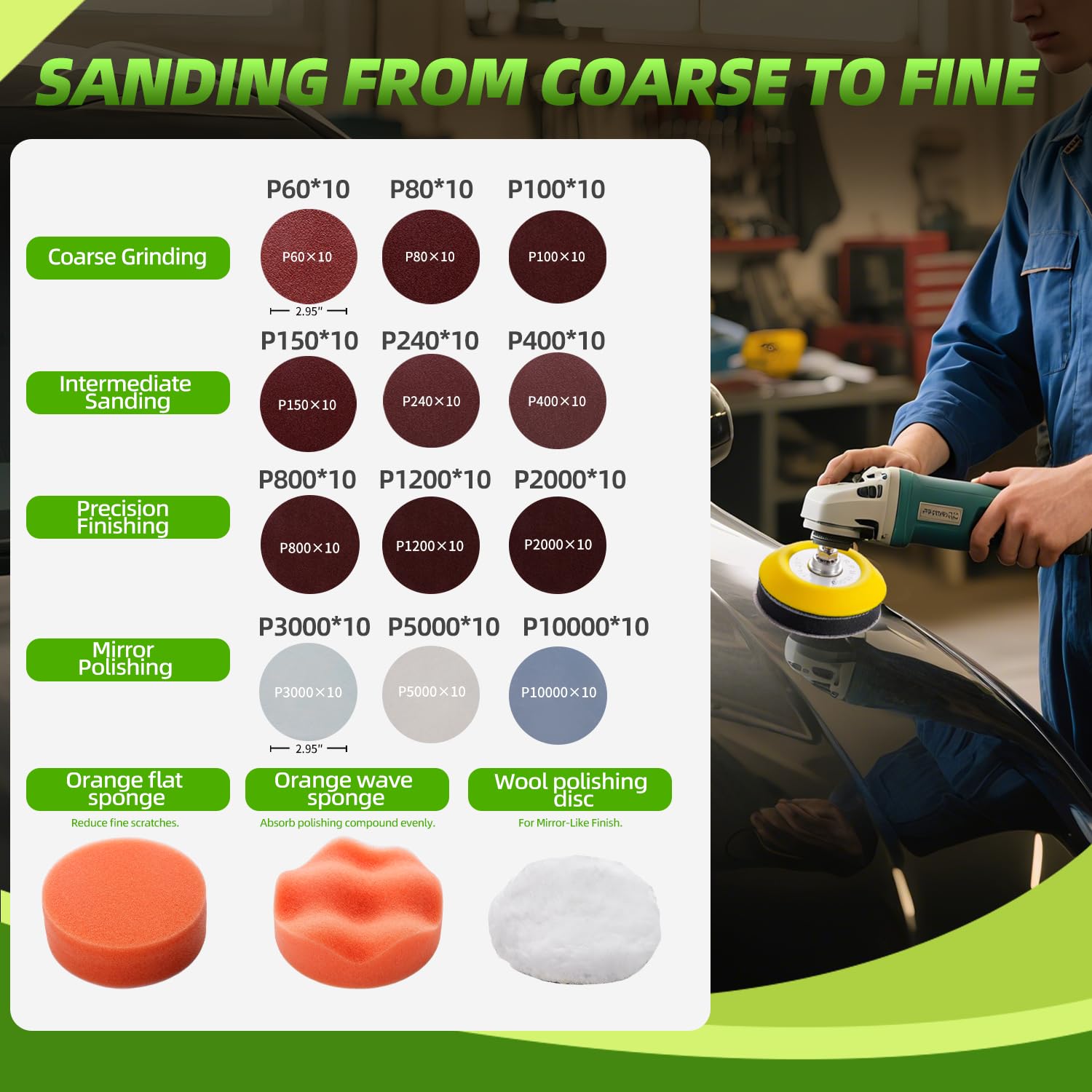 Mega praktisches Schleifpapier-Set mit 120 Teilen! Perfekt für alle Heimwerker und Profis. Die 75mm Scheiben haben Klett-Rückseite - super einfach zu wechseln. Von grob bis superfein ist alles dabei: 60, 80, 100, 150, 240, 400, 800, 1200, 2000, 3000, 5000 und sogar 10000er Körnung. Jede Körnung ist markiert, damit du immer weißt welche du in der Hand hast. Aus schwarzem Siliziumkarbid - richtig langlebig und verschleißfest. Funktioniert nass und trocken, staubt kaum und hat schnelle Schleifkraft. Passt auf die meisten Schleifgeräte wie Winkelschleifer, Bohrmaschinen oder Druckluftschleifer. Im Set sind auch 2 PU-Schleifteller, 4 Schäfte, 2 Wollschieben und 3 Polierschwämme dabei. Egal ob du Auto lacke polieren willst, Holz bearbeitest oder Metall glänzend kriegst - mit diesem Set bist du perfekt ausgestattet. Die gleichmäßigen Partikel sorgen für saubere Ergebnisse ohne Kratzer. Einfach mal ausprobieren und du wirst sehen wie viel einfacher Schleifarbeiten damit werden!