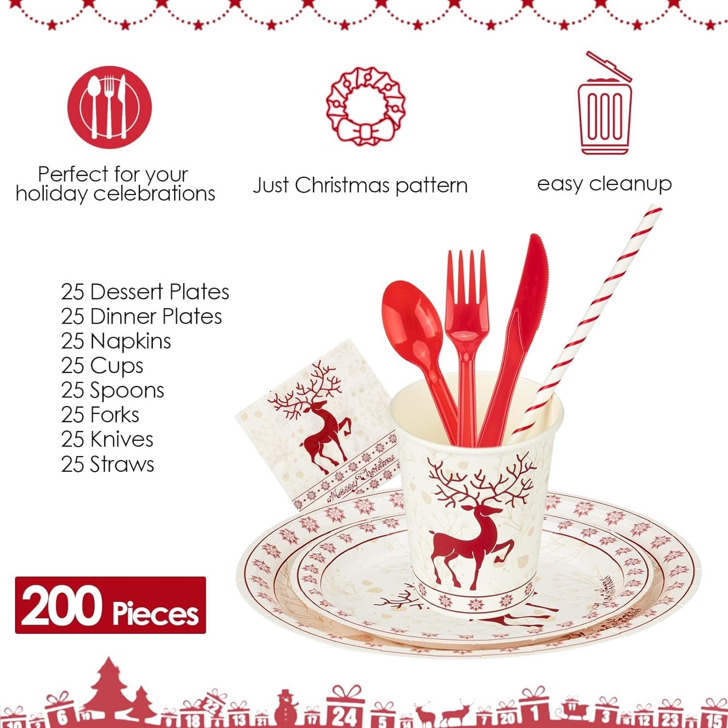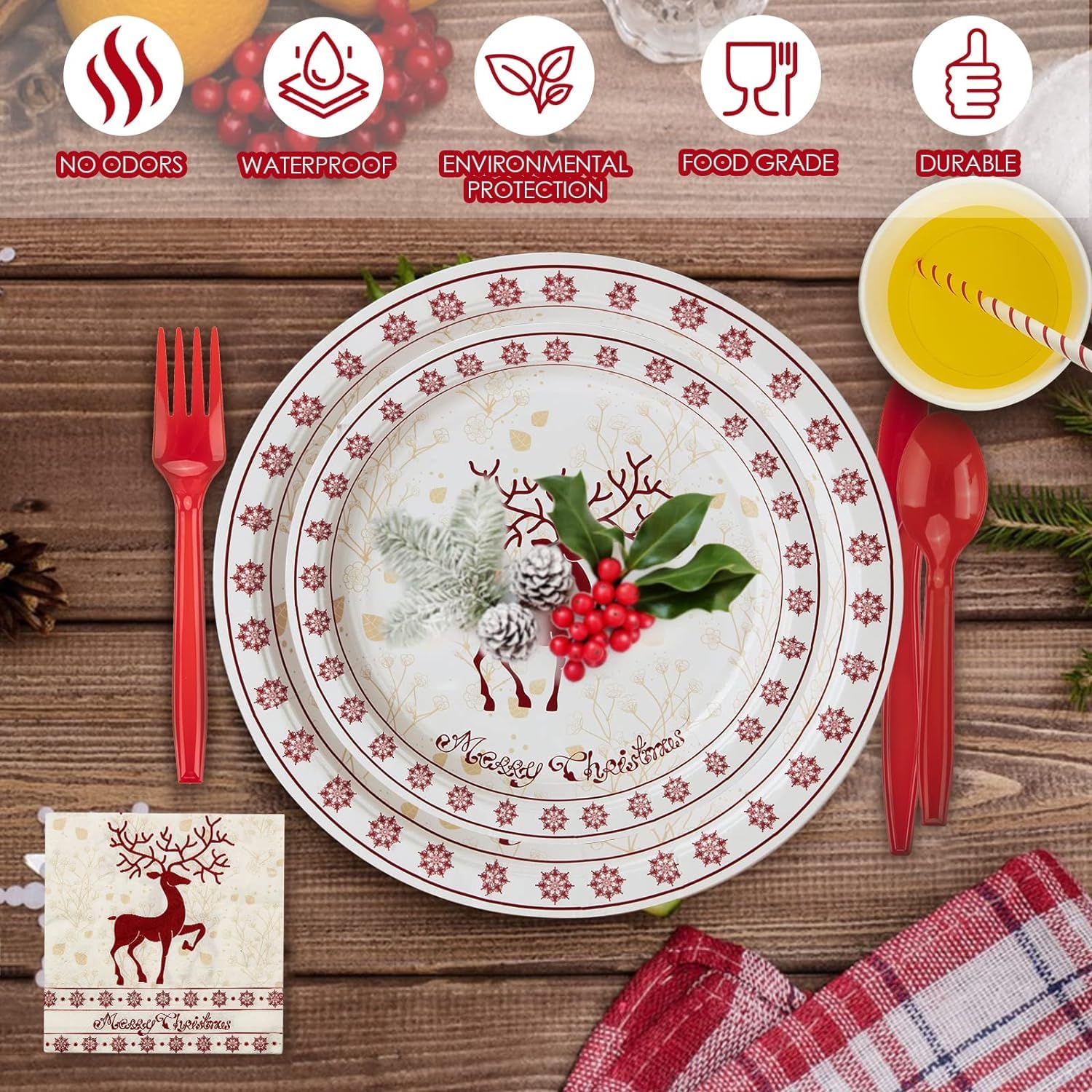 Weihnachtsfeier geplant? Dieses Geschirr-Set macht deine Party perfekt! 120 Teile im süßen Plaid-Design mit Weihnachtsmotiven - da freut sich jeder Gast! Im Set findest du alles: 24 große Speiseteller (23 cm), 24 Salatteller (18 cm), 24 Becher (270 ml), 24 Servietten und 24 wiederverwendbare Strohhalme. Alles aus lebensmittelechtem Papier, BPA-frei und biologisch abbaubar. Die Servietten sind dreilagig - saugen also auch größere Sauereien auf ohne durchzuweichen. Nach der Party einfach wegwerfen - kein Abwasch nötig! Perfekt für Weihnachtsfeiern, Winterpartys oder gemütliche Familienabende. Das rot-weiße Karomuster mit goldigen Weihnachtsmotiven sorgt für sofortige Feststimmung. Einfach auspacken und deine Gäste beeindrucken! Für 24 Personen - ideal für die meisten Feiern. Umweltbewusst feiern war noch nie so einfach!