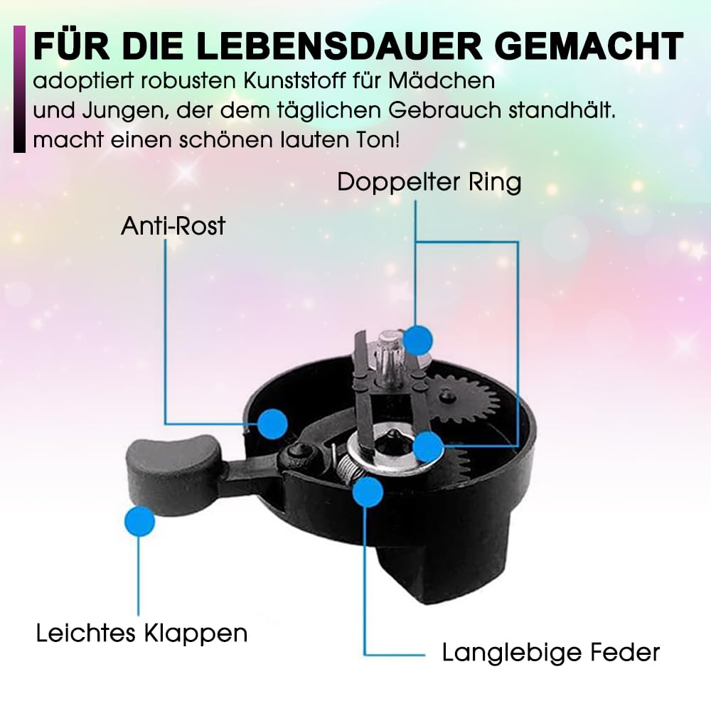 Sicherheit geht vor - besonders bei den Kleinen! Diese superlaute 120db Fahrradklingel warnt sicher und zuverlässig. Passt auf alle Standard-Lenker mit 2,3cm Durchmesser - ob Kinderfahrrad, Laufrad, Dreirad oder Roller. Aus robustem ABS-Aluminium ist sie witterungsbeständig und hält auch bei Schmuddelwetter. Die einfache Montage mit Schraubendreher klappt in Sekunden, und die Klingel kann links oder rechts am Lenker befestigt werden. Mit lustigen Designs für Mädchen und Jungen macht das Klingeln gleich doppelt Spaß. Dein Kind ist immer sicher unterwegs und hat noch dazu Freude daran, zu klingeln. Ein muss für jeden jungen Radfahrer!