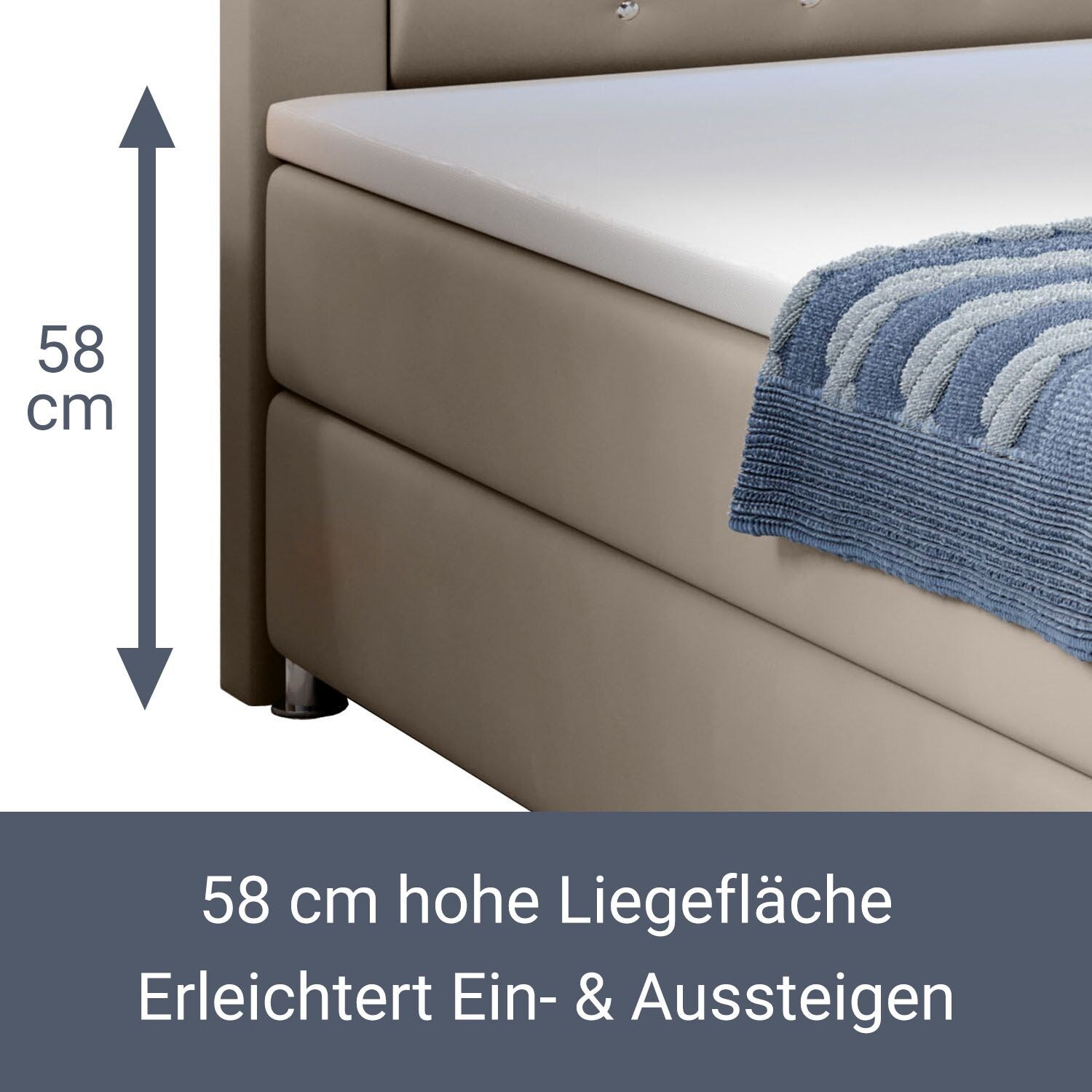 Mann, dieses Boxspringbett bringt Hotel-Feeling ins Schlafzimmer! Das Vancouver in Beige ist 140x200 cm groß und hat alles was du brauchst: Bonell-Federkernmatratze (21 cm, H3), extra 4 cm Topper für mega Weichheit und sogar LED-Beleuchtung für coole Stimmung. Mit 58 cm Höhe steigst du super bequem ein und aus - ideal für Große oder Senioren. Das Kopfteil ist dick gepolstert - perfekt zum Anlehnen beim Lesen oder Fernsehen. Aus stabilem Holz mit Metallfüßen - das Ding wackelt nicht! Der Stoffbezug ist leicht zu reinigen und sieht richtig edel aus. Für Leute bis 100 kg geeignet. Einfach aufbauen und ab in den Luxus-Schlaf - damit schläfst du wie im 5-Sterne-Hotel!