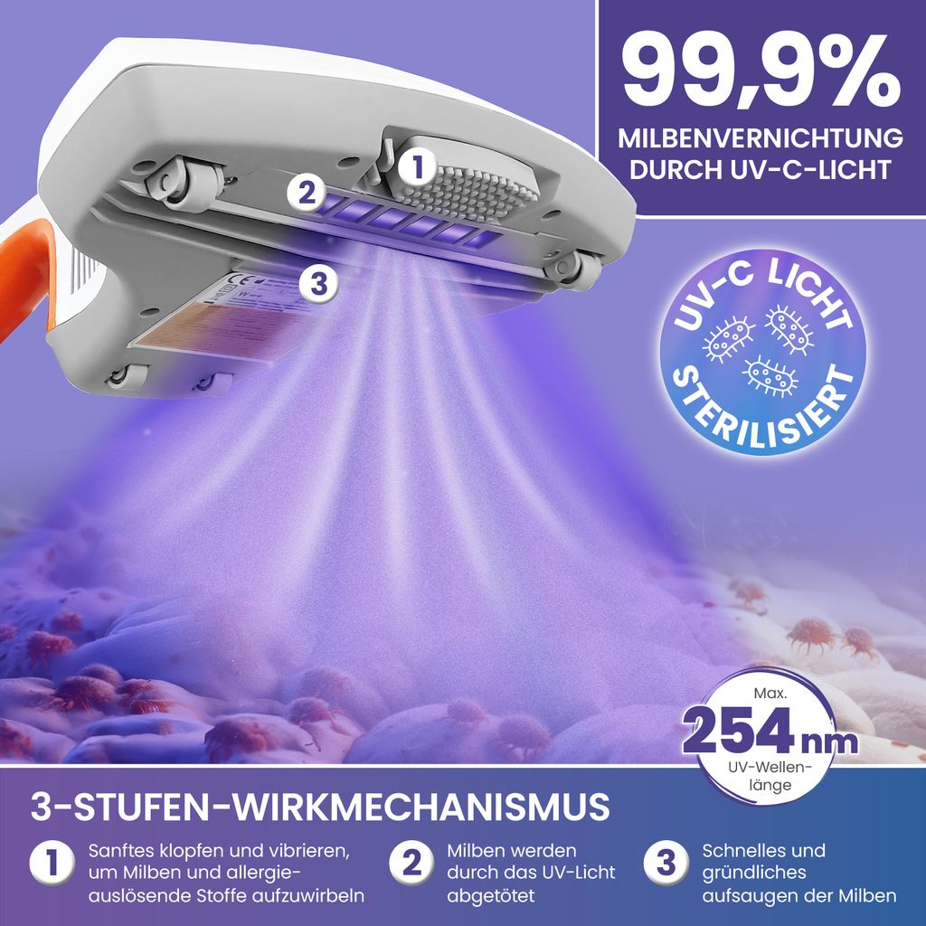Hast du auch ständig diese lästigen Allergieprobleme? Dann ist dieser Milbensauger genau das Richtige für dich! Mit seiner starken 15kPa Saugkraft und dem UV-Licht macht er kurzen Prozess mit Hausstaubmilben in deiner Matratze. Stell dir vor: Du fährst einfach mit diesem praktischen Gerät über deine Matratze und entfernst damit 99,9% aller Milben und Allergene! Das Geheimnis sind die fünf verschiedenen Technologien, die zusammenarbeiten: UV-Licht tötet die Biecher, Ultraschall stoppt die Vermehrung, 55°C Heißluft trocknet sie aus, die Metallbürste löst alles und die Saugkraft entfernt die Reste. Super praktisch ist das Zwei-Behälter-System - da verstopft nichts und die Reinigung geht ratzfatz. Mit nur 1,7 kg ist das Teil auch noch richtig leicht zu handhaben. Perfekt für Allergiker, Familien mit Kindern oder Haustierbesitzer! Und das Beste: Die UV-Lampe schaltet sich automatisch ab, wenn du sie anhebst - total sicher also. Mach Schluss mit Milben und genieße endlich wieder erholsamen Schlaf!