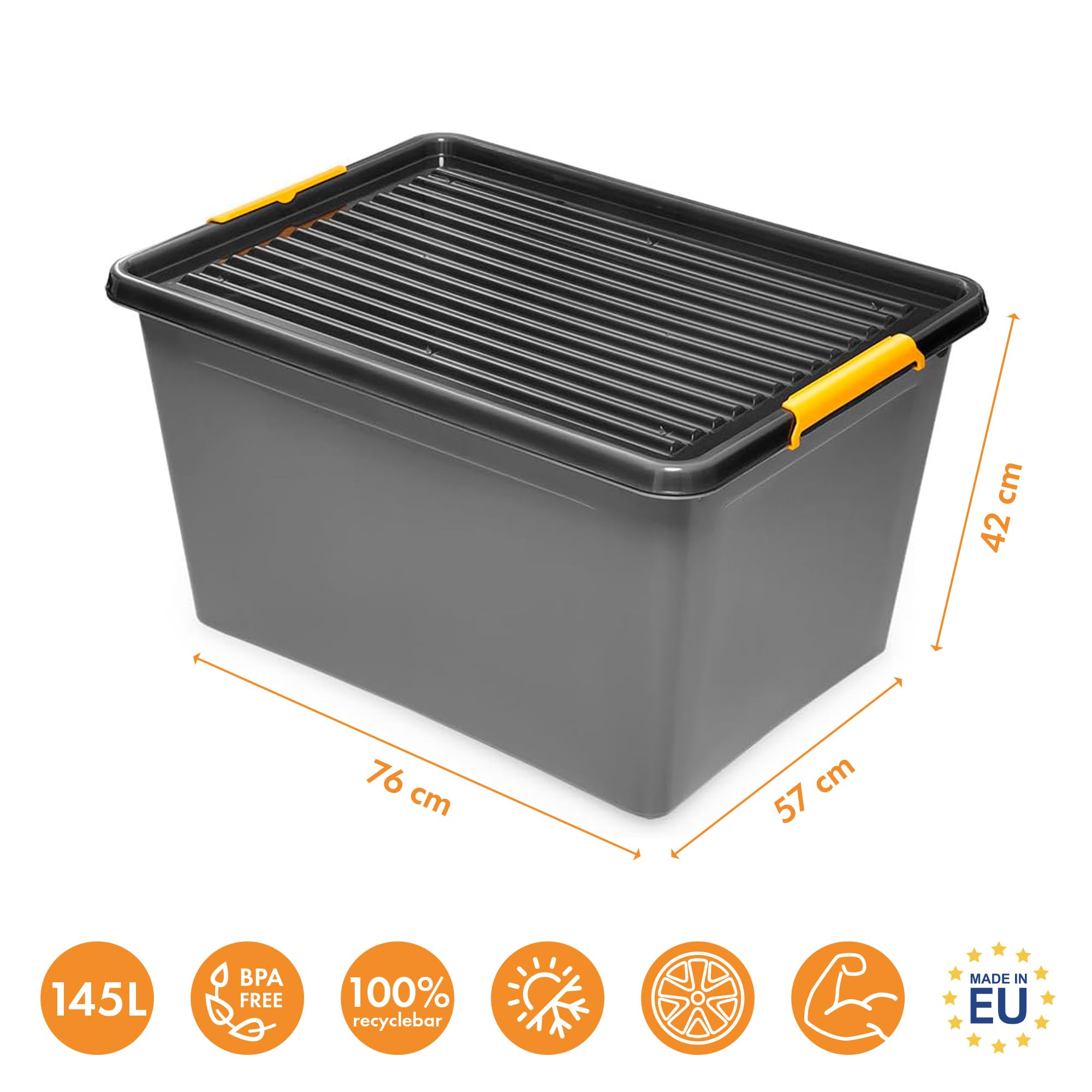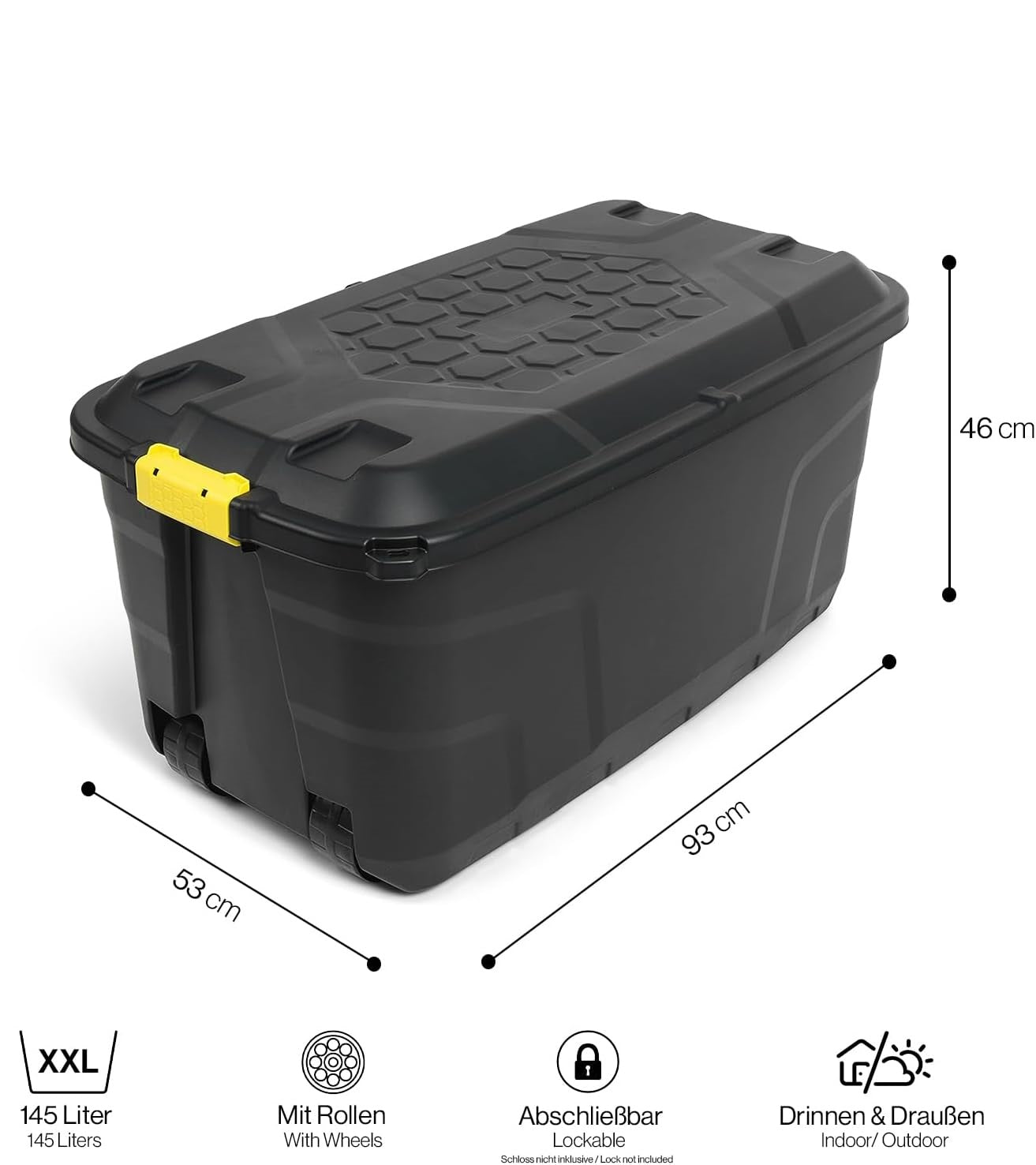 Riesig praktisch diese Transportbox! Mit stolzen 175 Litern Volumen - da passt alles rein: Kissen, Spielzeug, Werkzeug, Gartengeräte... Maße: 93x55x53cm. Mit 4 robusten Rollen und abschließbarem Deckel (Schloss nicht inklusive). Aus stabilem Kunststoff, wetterfest und UV-beständig. Super für Garage, Keller, Garten oder als mobile Box für's Gewerbe. Mehrere Boxen stapelbar, leicht zu reinigen. Bring Ordnung in dein Leben - diese Box macht's möglich! Einfach befüllen und losschieben!