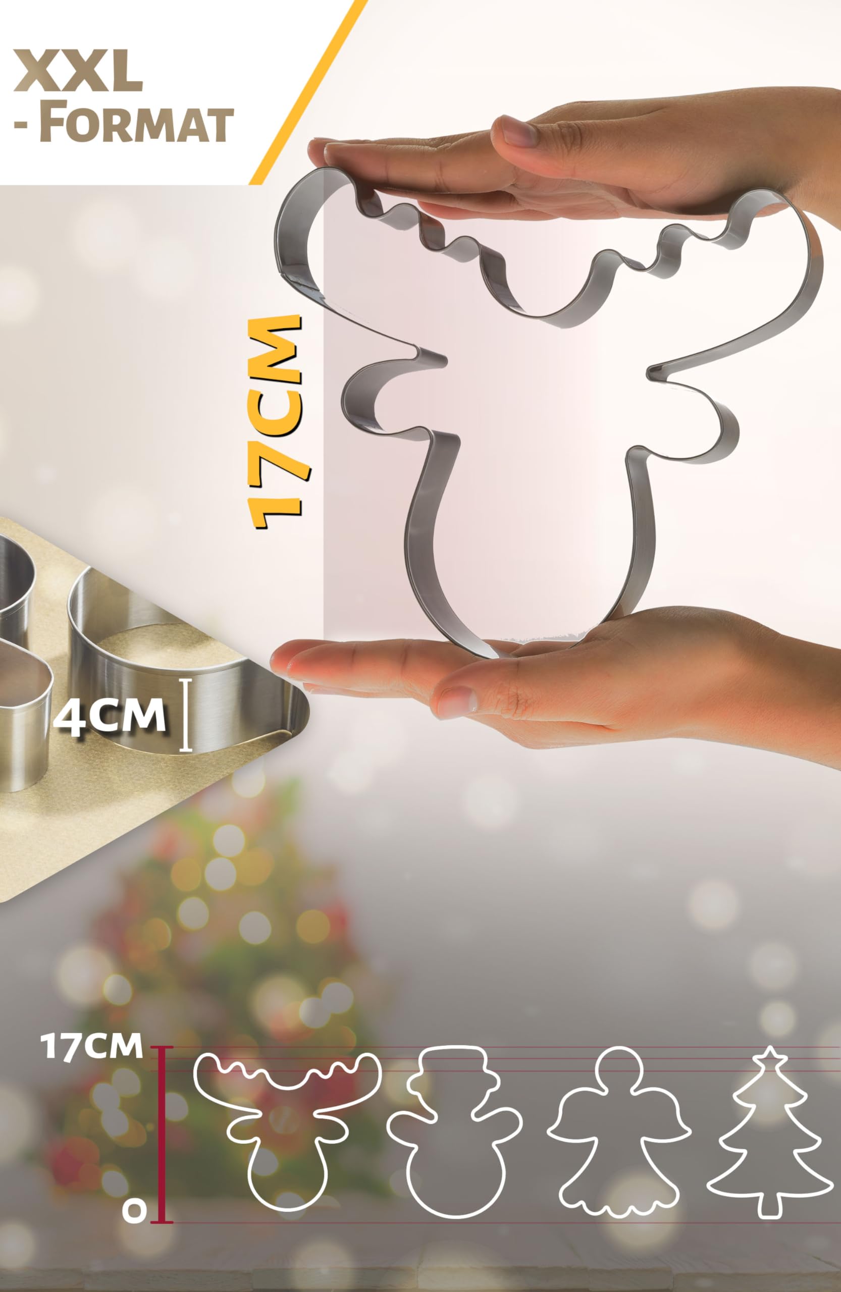 Weihnachtsbäckerei mal anders! Mit diesen riesigen Ausstechformen im XXL-Format (jeweils ca. 17cm groß) backst du die coolsten Riesen-Plätzchen ever. Im Set sind vier verschiedene weihnachtliche Motive dabei: Rentier, Engel, Weihnachtsbaum und Schneemann - alles was das Herz zur Weihnachtszeit begehrt. Aus hochwertigem Edelstahl gefertigt, sind die Formen super stabil, 100% rostfrei und spülmaschinenfest. Die scharfen Ausstechkanten sorgen für saubere Konturen, während die abgerundeten Oberkanten besonders kinderfreundlich sind. Perfekt nicht nur für Plätzchen, sondern auch für Mini-Küchlein, kleine Törtchen oder kreative Deko-Projekte. Von Menz - einer Marke mit Tradition seit 1880, die weiß, was gutes Backzubehör ausmacht. Damit wird deine Weihnachtsbäckerei zum absoluten Highlight und die Ergebnisse sehen einfach professionell aus. Ob für den Hausgebrauch oder als Geschenk für Backbegeisterte - diese Ausstechformen machen einfach Laune!