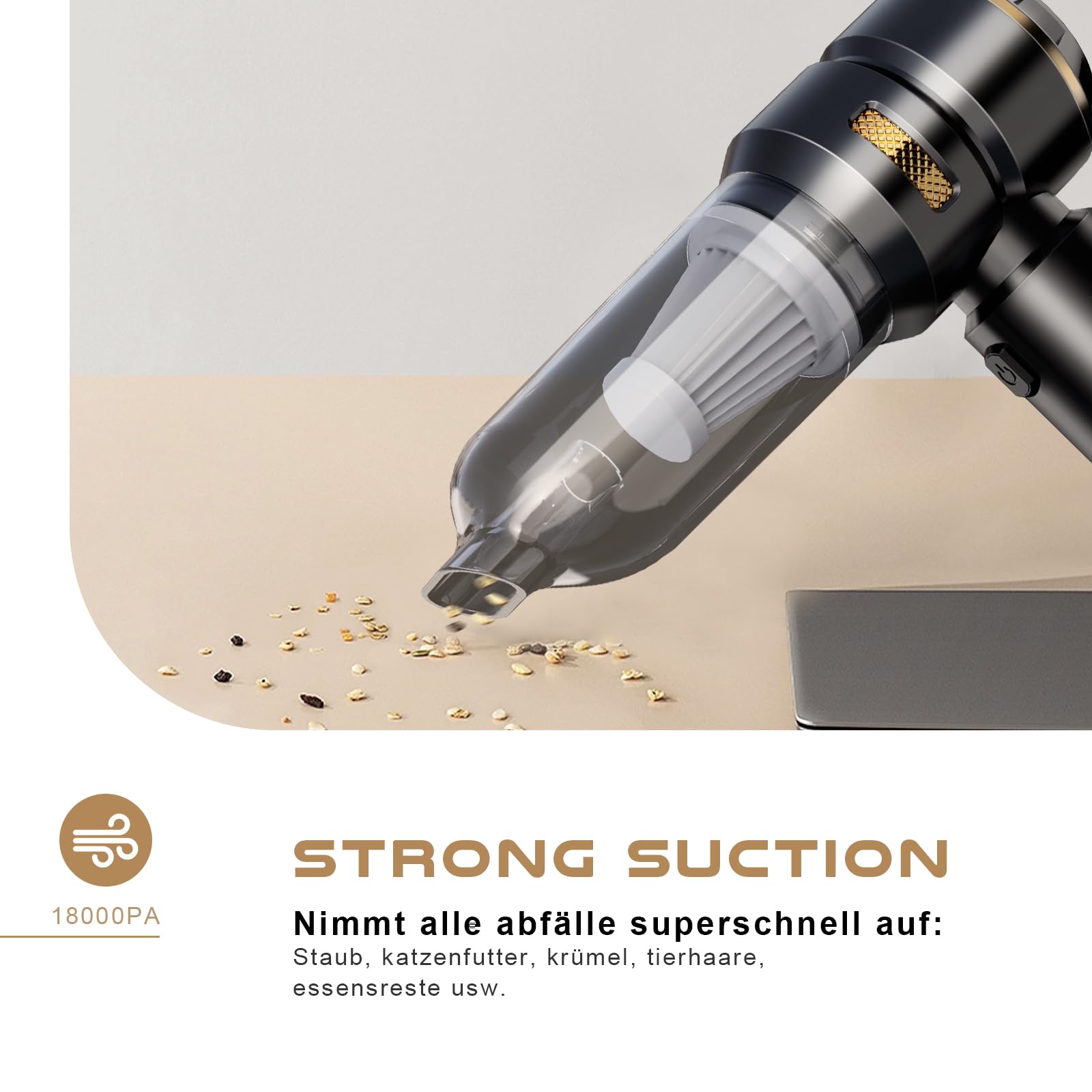 Ordnung im Auto war noch nie so einfach! Dieser kraftvolle Handstaubsauger mit 18000Pa Saugleistung macht kurzen Prozess mit Krümeln, Staub und Haaren. Mit 3 einstellbaren Leistungsstufen und 4000mAh Akku für bis zu 30 Minuten Laufzeit. Der waschbare HEPA Filter und 200ml Behälter sind super praktisch. Kabellos und nur 0,9kg leicht - perfekt für Auto, Boot, Camping oder kleine Wohnungen. Inklusive verschiedenen Aufsätzen für alle Ecken und Ritzen. USB-C Ladung macht das Aufladen einfach. Endlich kein lästiges Kabel mehr beim Saubermachen!