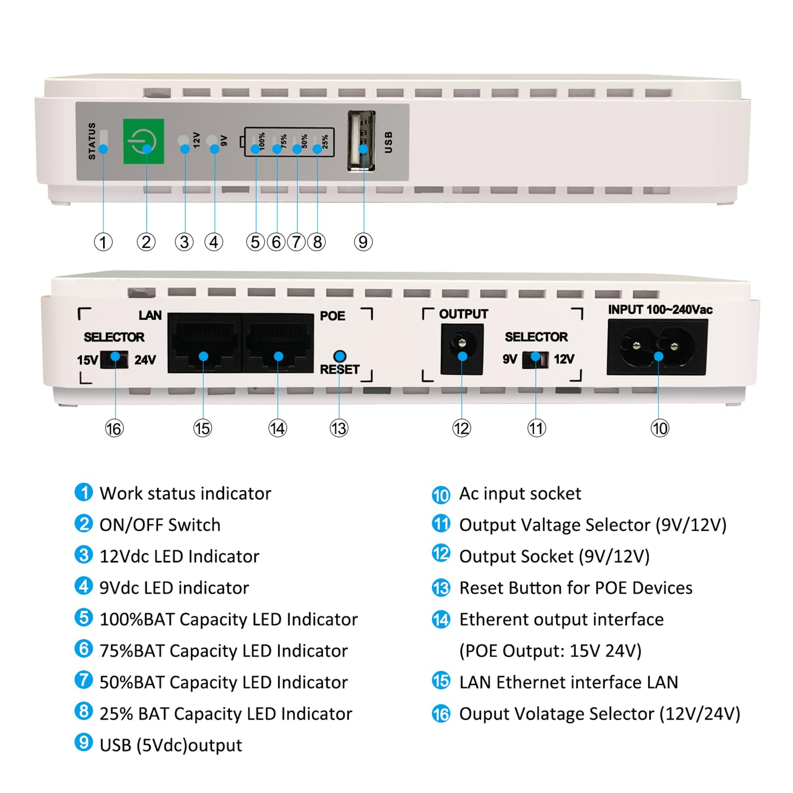 Nie mehr Internetausfall bei Stromstörungen! Diese Mini-USV hält deinen Router und Kameras am Laufen. Kompakt und tragbar - nur 161x105x34mm groß. Mit austauschbarem Akku (3,7V, nicht im Lieferumfang) für maximale Flexibilität. Verschiedene Ausgänge: USB mit 5V/9V/12V und POE mit 15V/24V. Integrierter Schutz vor Überhitzung, Kurzschluss, Überspannung und Überladung. Flammhemmendes Gehäuse für maximale Sicherheit. Perfekt für Überwachungskameras, Router, Modems oder Zugangssysteme. Einfach Akku einsetzen, anschließen und sorgenfrei surfen. Lieferumfang: USV, 2 Gleichstromkabel, Netzkabel, Schraubendreher und Handbuch. Deine digitale Welt läuft weiter, auch wenn der Strom mal ausfällt!