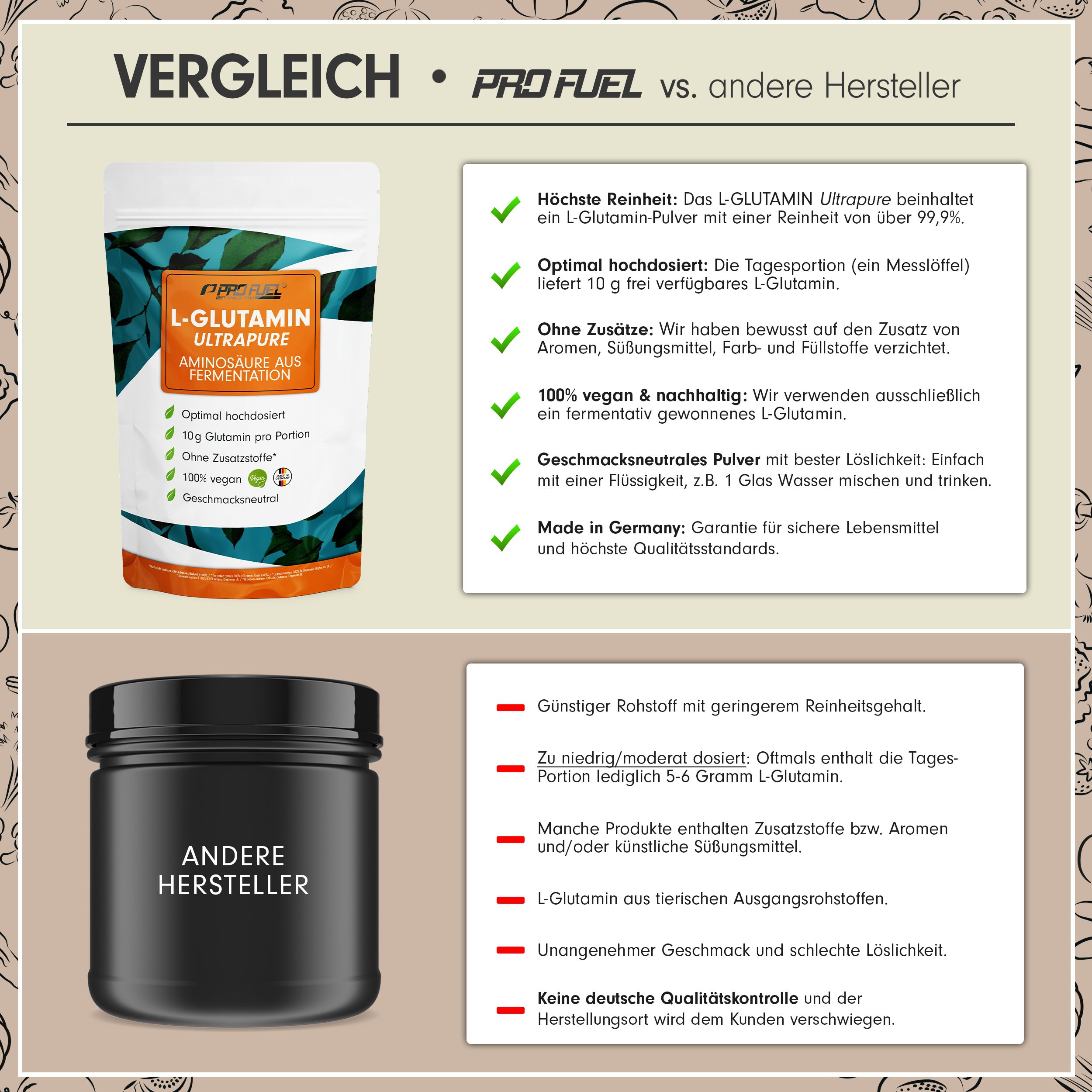 Sportler, dieses L-Glutamin Pulver ist genau das Richtige für eure Regeneration! 100% rein, ohne Füllstoffe oder Zusätze - nur das Wesentliche. Unterstützt den Muskelaufbau und das Immunsystem nach intensiven Trainingseinheiten. In Deutschland unter Laborbedingungen abgefüllt für höchste Qualität. Perfekt löslich und geschmacksneutral - einfach in Shakes oder Wasser mixen. Ob 100g oder 25kg - wir haben die passende Größe für dich. Für alle, die Wert auf Qualität und Reinheit legen. Schnellere Erholung, bessere Performance - probier's aus!