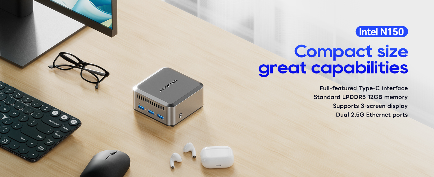 Dieser AOOSTAR R1 NAS Mini PC ist ein absolutes Kraftpaket im kompakten Format! Mit Intel Twin Lake N150 Prozessor (4 Kerne, bis 3,6GHz), 2 Bays für 3,5\/2,5\ SATA Festplatten (bis zu 40TB Gesamtspeicher) und einem M.2 NVMe Slot (bis 2TB) hast du genug Platz für alle deine Daten. Das Beste: Dual 2,5G LAN Anschlüsse sorgen für ultraschnelle Netzwerkgeschwindigkeiten, dazu WiFi 6 und Bluetooth 5.2. Du kannst verschiedene Betriebssysteme installieren - Windows, Linux, oder als OPNsense/OpenWrt Router nutzen. Perfekt für Daten-Backups, Media-Server, Überwachungskamera-Speicher oder als Virtualisierungsplattform. Mit HDMI, DisplayPort, USB 3.0/2.0 und Typ-C Anschlüssen ist er super vielseitig. Ideal für Home-Office, kleine Unternehmen oder Tech-Enthusiasten!