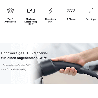 Schneller laden mit dem POWERBEST Typ 2 Kabel! Mit 11kW Ladeleistung bist du bis zu 50% schneller als mit Standard-Ladekabeln. Kompatibel mit allen E-Autos mit Typ-2-Anschluss - also perfekt für Tesla Model 3/Y/S/X, VW ID.3, BMW i3 und viele mehr. Das 5m Kabel gibt dir genug Reichweite an jeder Ladestation. Übrigens: IP65 geschützt - hält also Regen und Staub stand! Mit TÜV-Zertifizierung für maximale Sicherheit. Einfach einstecken und losladen! Länge: 5m • Leistung: 11kW • Strom: 16A • Kompatibel: Alle Typ-2 Fahrzeuge • Schutzart: IP65 • Temperatur: -35°C bis +50°C • Zertifiziert: TÜV & RoHS • Inklusive Tragetasche