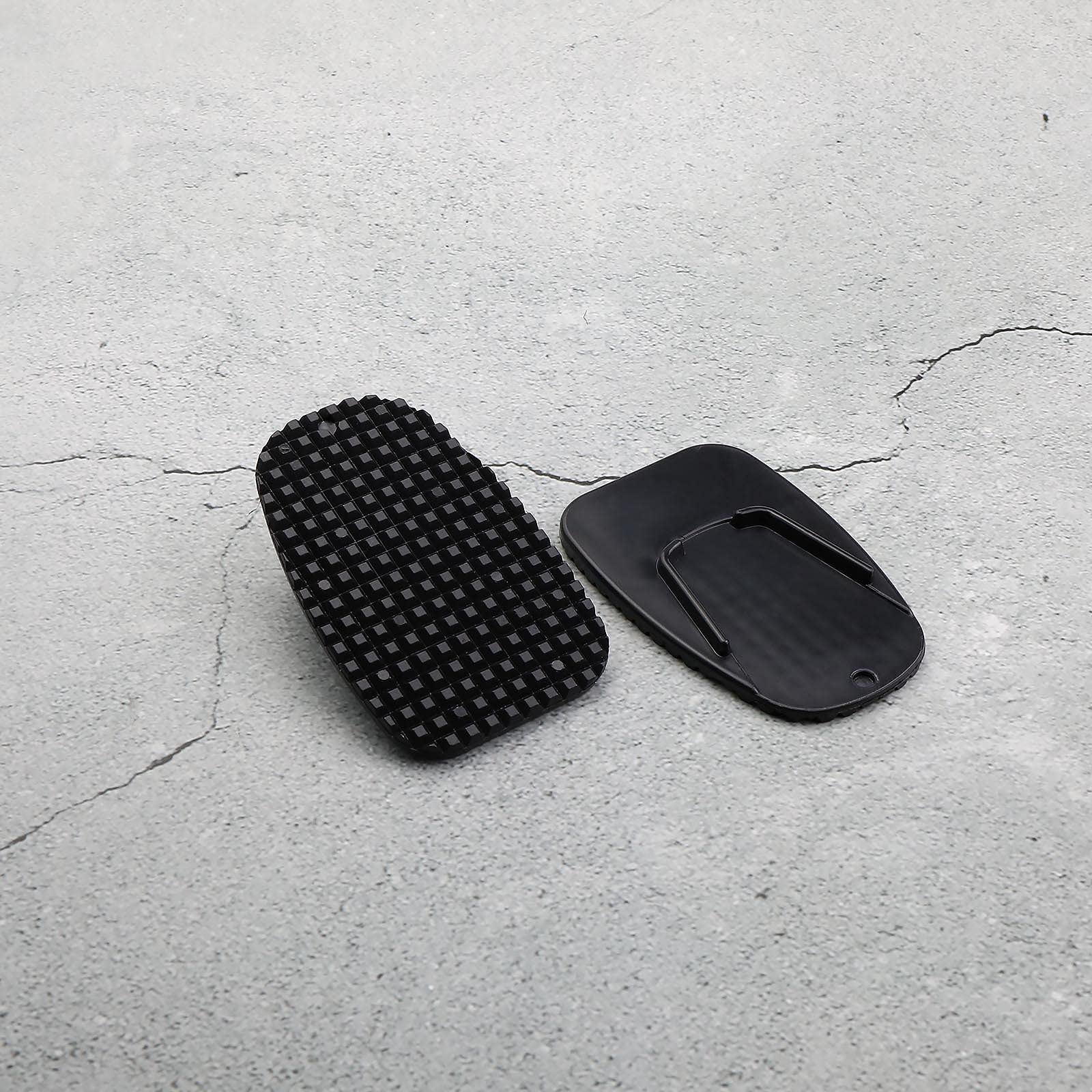 Aus stabilem PP-Kunststoff mit rutschfester Unterseite. Hitze- und korrosionsbeständig - hält auch bei sommerlicher Hitze auf Asphalt. Mit 90x58 mm Größe passt es unter fast jeden Seitenständer.