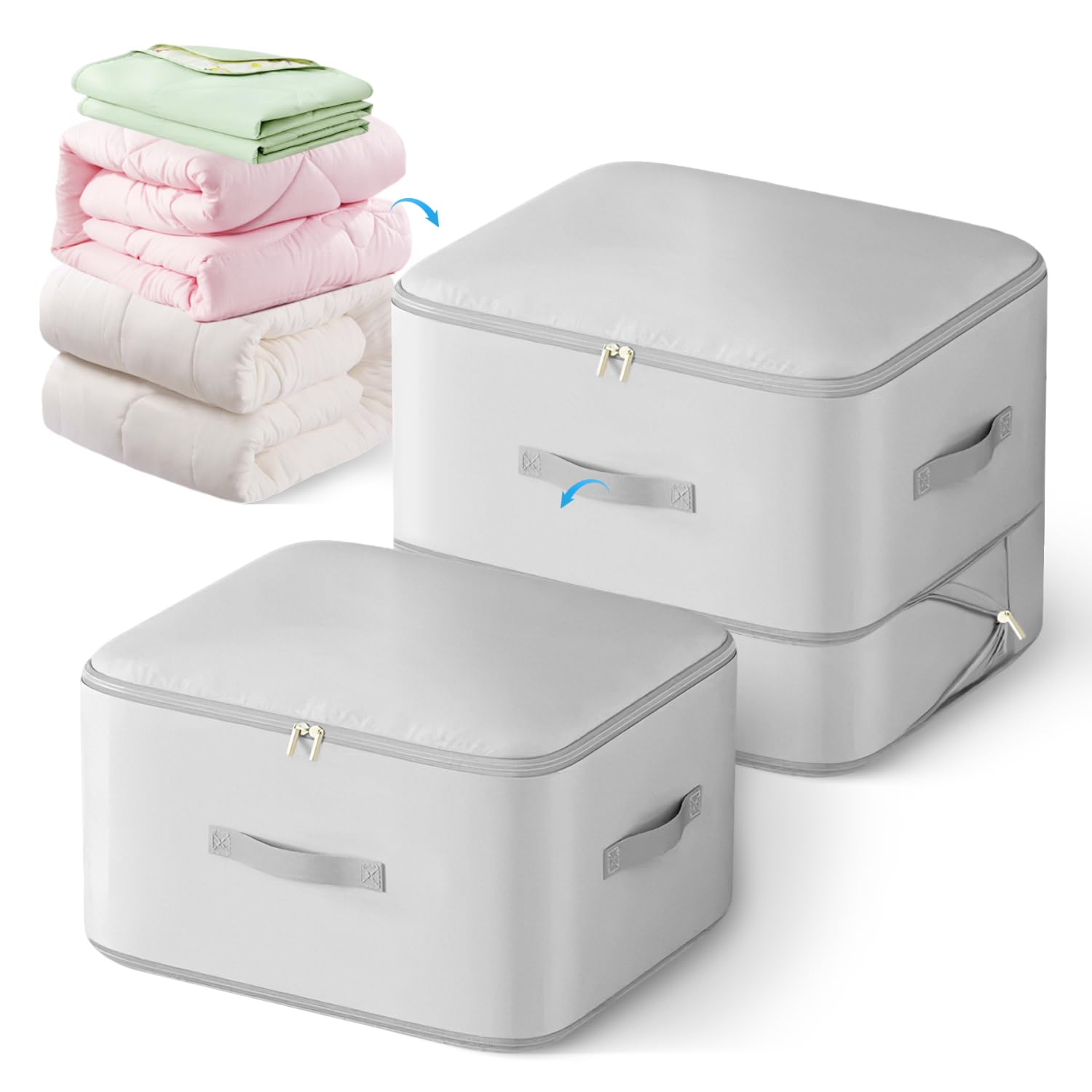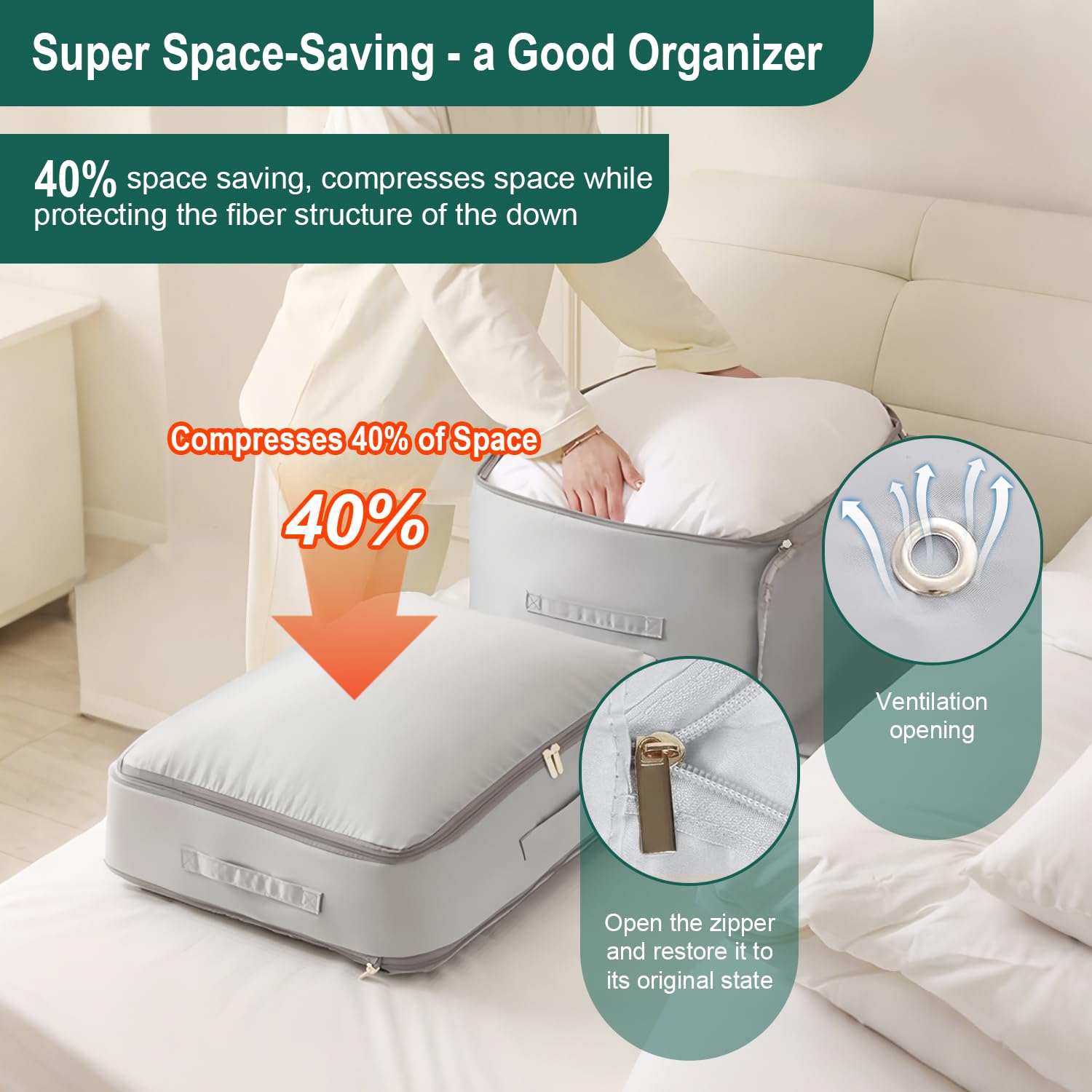Schluss mit vollem Kleiderschrank! Diese genialen selbstkomprimierenden Organizer schaffen bis zu 40% mehr Platz - ganz ohne Staubsauger. Im Set sind 2 Taschen in verschiedenen Größen enthalten: XL (54x42x50cm, komprimierbar auf 25cm) und L (54x42x30cm, komprimierbar auf 15cm). Einfach Kleidung, Decken oder Bettwäsche einfüllen, Reißverschluss schließen und zusammenpressen - schon ist die Tasche deutlich flacher! Das weiche, wasserdichte Twill-Gewebe schützt zuverlässig vor Staub und Feuchtigkeit. Die seitlichen Metalllöcher lassen überschüssige Luft entweichen. Der robuste Zwei-Wege-Reißverschluss und der praktische Tragegriff machen Handhabung und Transport zum Kinderspiel. Perfekt für Winterdecken, dicke Jacken, Bettbezüge oder Reisegepäck. Wenn du wieder Platz brauchst, einfach Reißverschluss öffnen und die Tasche nimmt sofort ihre ursprüngliche Form an. Ein Must-Have für alle mit begrenztem Stauraum!