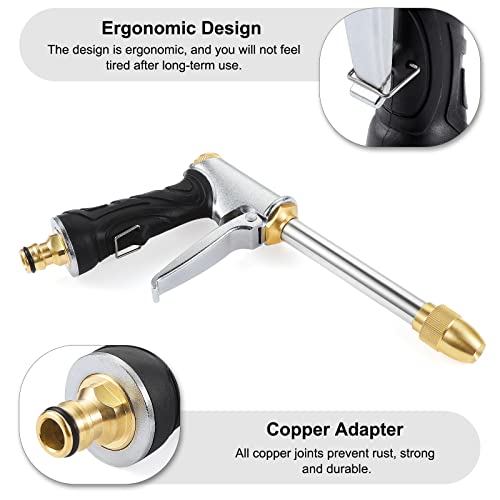 Diese Hochdruck-Spritzpistole ist ein echter Alleskönner! Mit 48cm Länge kommst du super an alle Ecken und Winkel. Das 2-in-1 Design hat sowohl eine kraftvolle Strahldüse für hartnäckigen Schmutz auf Beton oder Ziegeln, als auch eine sanfte Fächerdüse für größere Flächen wie Fenster oder Gartenpflanzen. Kompatibel mit Standard 3/4\ Gartenschläuchen - passt also an die meisten Wasseranschlüsse. Aus ABS-Kunststoff, Legierung und Kupfer - leicht aber extrem langlebig. Der abnehmbare Schlauch ist mega praktisch: Für enge Räume einfach abnehmen oder platzsparend verstauen. Perfekt für Auto waschen, Terrasse reinigen, Pflanzen gießen - einfach für alles rund um Haus und Garten. Die einstellbaren Sprühmuster schonen Oberflächen aber packen trotzem richtig zu. Einfach ein robustes Teil das seinen Job richtig gut macht!