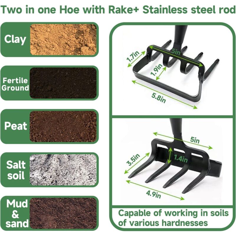 Rückenschonendes Gärtnern war noch nie so einfach! Diese 2-in-1 Gartenhacke mit 170cm Länge ermöglicht dir bequemes Arbeiten im Stehen. Auf der einen Seite die praktische Steigbügel-Hacke, die Unkraut einfach abschneidet, auf der anderen Seite eine 4-Zahn-Harke zum Lockern und Einebnen. Der verstellbare Griff passt sich deiner Größe an - kein Bücken mehr! Aus dickem Edelstahl gefertigt, rostfrei und super stabil. Einfach in 4 Teilen zusammenschrauben, ohne Werkzeug. Perfekt für Gemüsebeete, Blumenbeete oder das Umgraben kleiner Flächen. Länge: 170 cm | Material: Edelstahl | Funktionen: Hacken, Harken, Lockern | Besonderheit: verstellbarer Griff
