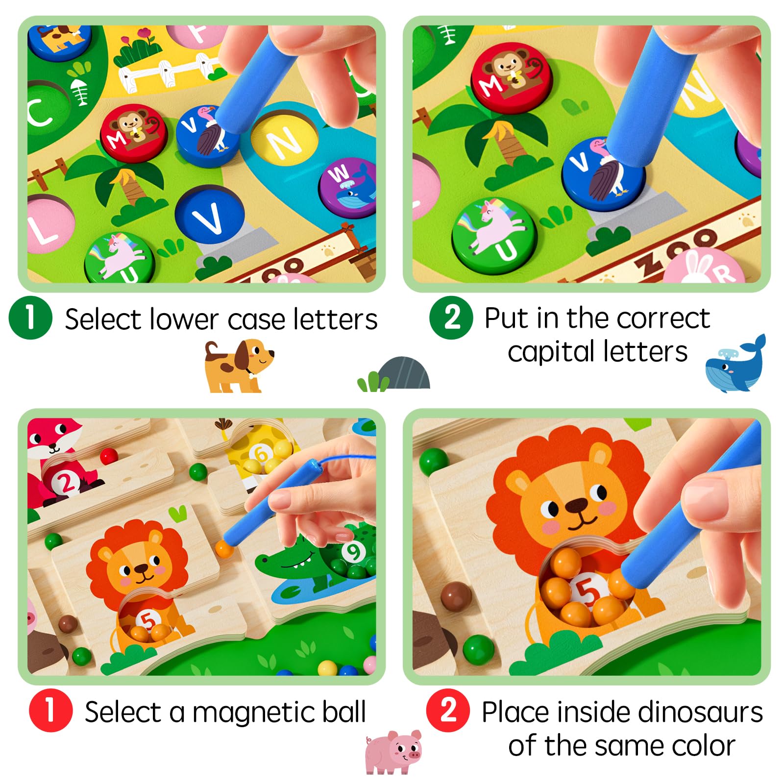 Lernen kann so viel Spaß machen! Dieses 2-in-1 magnetische Labyrinth ist perfekt für neugierige Kindergartenkinder. Doppelseitig: Auf der einen Seite lernen sie Buchstaben kennen, auf der anderen Seite Zahlen von 1-10. Mit süßen Zoo-Tieren in verschiedenen Farben, die das Ganze noch interessanter machen. Aus hochwertigem Holz gefertigt, mit sicher befestigten Kugeln unter Acrylglas - nichts kann verloren gehen oder verschluckt werden. Die glatten Kanten schützen kleine Finger vor Verletzungen. Dieses Montessori-Spielzeug fördert spielerisch die Hand-Augen-Koordination, Feinmotorik und logisches Denken. Perfekt für Jungen und Mädchen von 3-5 Jahren - ob als Geburtstagsgeschenk, zu Weihnachten oder einfach so. Dein Kind wird stundenlang beschäftigt sein und dabei ganz nebenbei was lernen! Ein pädagogisch wertvolles Spielzeug, das wirklich Sinn macht.