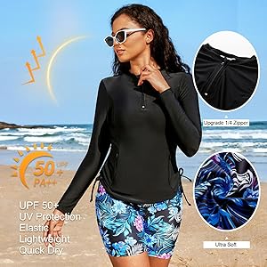 Bereit für den Strand? Dieses 2-teilige SHEKINI Rash Guard Set kombiniert Style und Schutz! Enthält ein Kurzarm-Shirt mit festen Polsterungen (kein extra BH nötig!) und praktische Boardshorts mit Seitentaschen für Handy & Co. Das UPF 50+ Material blockt schädliche UVA/UVB Strahlen komplett ab - perfekt für sonnige Tage! Der weiche, elastische Stoff ist super bequem und atmungsaktiv. Ideal für Schwimmen, Tauchen, Kajak oder einfach Strandspaziergänge. Wichtig: Vor dem Kauf die Größentabelle checken! Das coole Farbblock-Design macht dich zum Hingucker am Wasser. Dein perfekter Begleiter für alle Wasseraktivitäten!