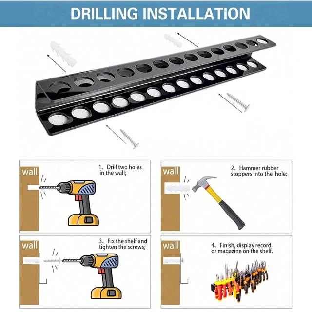 Aus robustem, pulverbeschichtetem Stahl - hält ewig. Einfache Montage an Holz, Beton oder Ziegel. Spart Platz auf der Werkbank und du findest sofort, was du suchst.