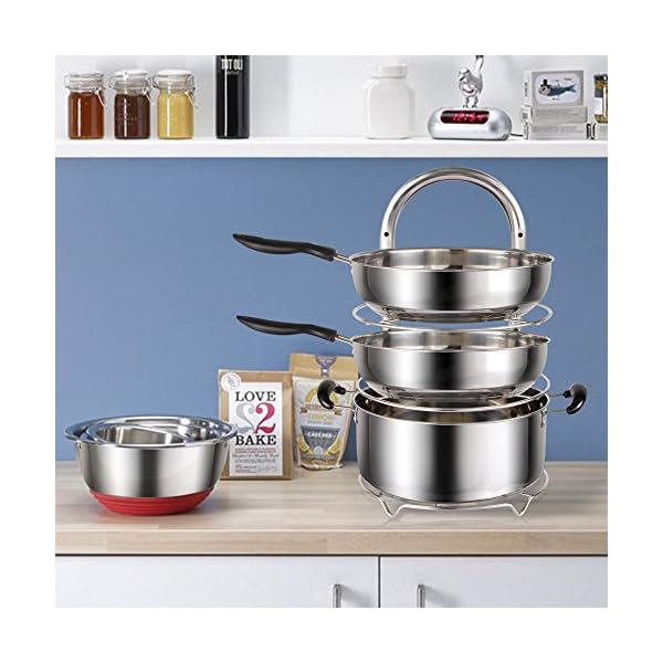 Perfekt für alle, die in der Küche Ordnung lieben! Dieses 2-teilige Topfgestell aus robustem Edelstahl ist ein echter Allrounder. Mit den Maßen 23x20x6 cm bietet es stabilen Halt für Ihre Töpfe, Pfannen und Woks. Das coole daran: Sie sparen nicht nur Platz in Ihren Schränken, sondern können die Ringe auch als Dampfgarer oder Topflappen verwenden. Das runde Design kratzt nicht an Ihren Tischen oder Herdplatten und die silberne Optik passt in jede Küche. Ob für Hot Pot, Bratpfannen oder Kochtöpfe - dieses Set macht Ihr Koch-Erlebnis sicherer und organisiert. Einfach praktisch!