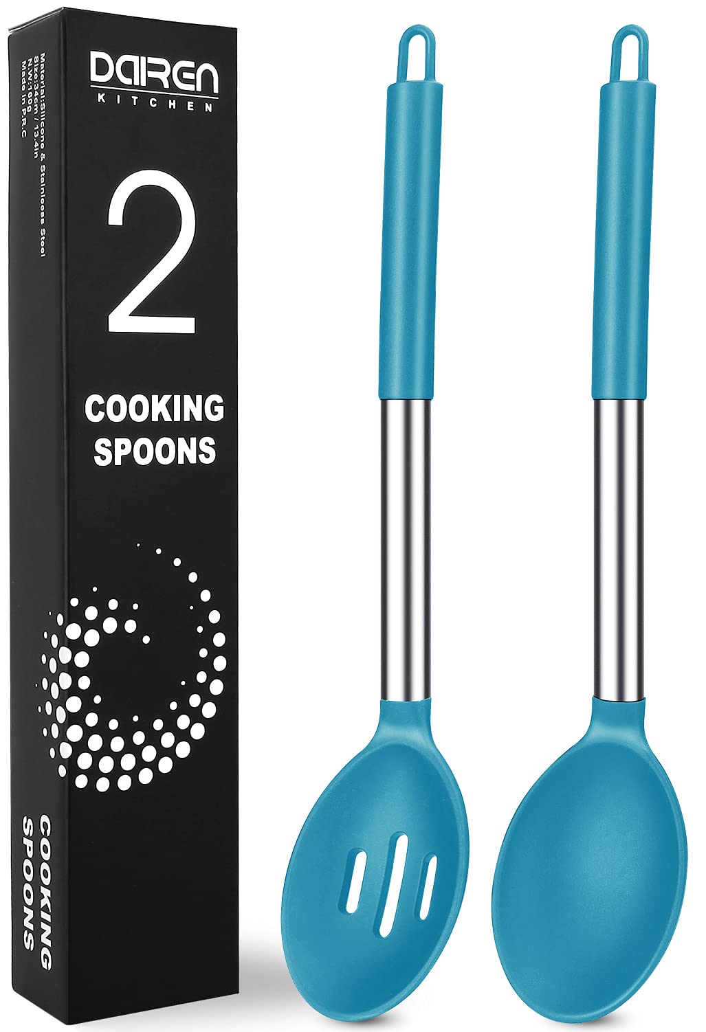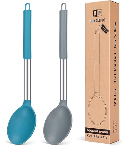Hey Köche! Dieses 2-teilige Silikon-Kochlöffel Set ist perfekt für alle, die ihre teuren Antihaft-Pfannen und Gusseisen-Kochgeschirr schützen wollen. Enthalten sind ein geschlitzter Löffel (3,2 x 13,7 Zoll) und ein stabiler Servierlöffel (2,75 x 13,4 Zoll). Aus hochwertigem, BPA-freiem Silikon gefertigt, das hitzebeständig bis 230°C (446°F) ist! Die Löffel schmelzen nicht, verformen sich nicht und zerkratzen dein Kochgeschirr nicht. Die ergonomischen Griffe liegen super in der Hand und sind viel haltbarer als Plastik-Geschirr. Perfekt zum Rühren von Soßen, Teig, Beilagen oder zum Servieren von Salaten. Spülmaschinenfest und mit Aufhängebohrung im Griff für praktische Aufbewahrung. Die Löffel verfärben sich nicht, laufen nicht an und rosten natürlich auch nicht. Einfach mit Seife und warmem Wasser reinigen und sie behalten ihr elegantes Aussehen. Damit machst du deine Küche komplett und kochst mit besten Utensilien!