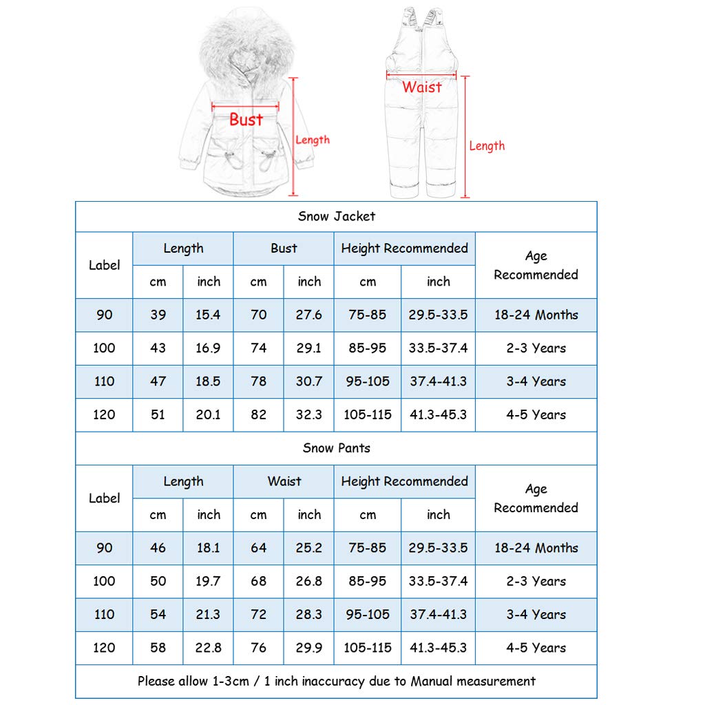 Oh wie süß! Dieser komplette Winteranzug macht dein Baby bereit für den Schnee. Im Set: eine warme Daunenjacke und praktische Skihose. Gefüttert mit 85% weißer Entendaunen - super warm aber trotzdem leicht. Das Nylon-Material ist wasserdicht und winddicht, hält also auch bei richtigem Schneetreiben trocken. Der Reißverschluss geht von der Brust bis zum Schritt - super easy zum An- und Ausziehen und für Windelwechsel. Die abnehmbare Kunstfell-Kappe sieht nicht nur niedlich aus, sondern wärmt auch die Ohren. Die elastischen Manschetten an Ärmeln und Hosenbeinen halten Schnee und Kälte draußen. Mit verstellbaren Schulterträgern kannst du die Hose perfekt anpassen. Größen von 90 (18-24 Monate) bis 120 (4-5 Jahre) - einfach die richtige Größe aus der Tabelle wählen. Perfekt für Skiurlaub, Schneespaziergänge oder einfach nur für kalte Wintertage. Dein Kleines kann draußen spielen ohne zu frieren!