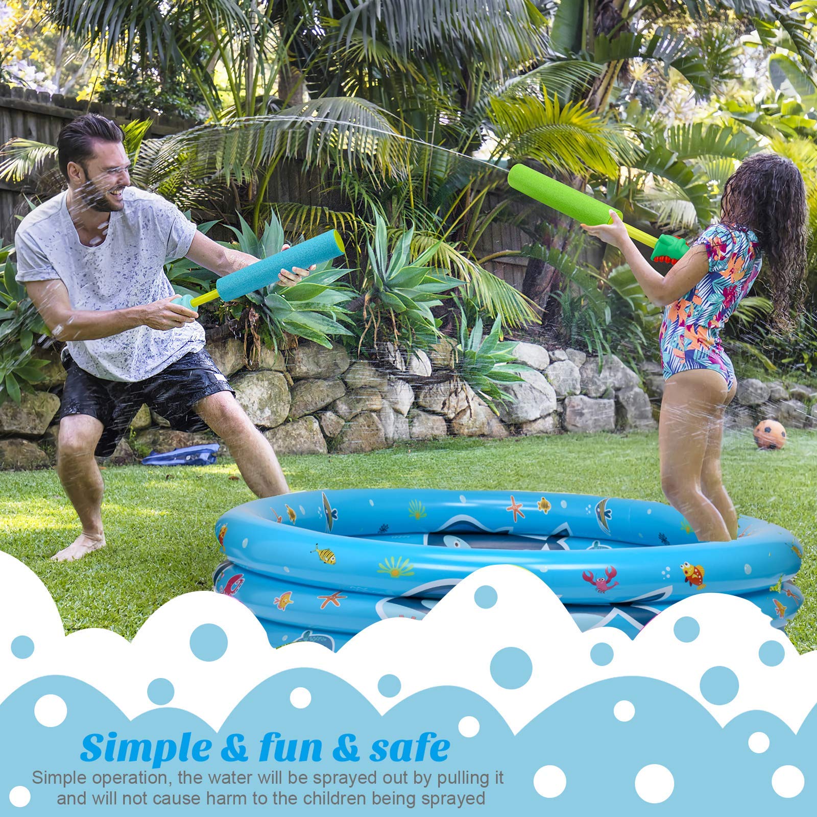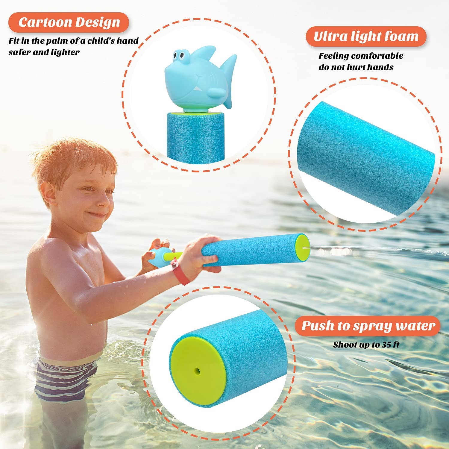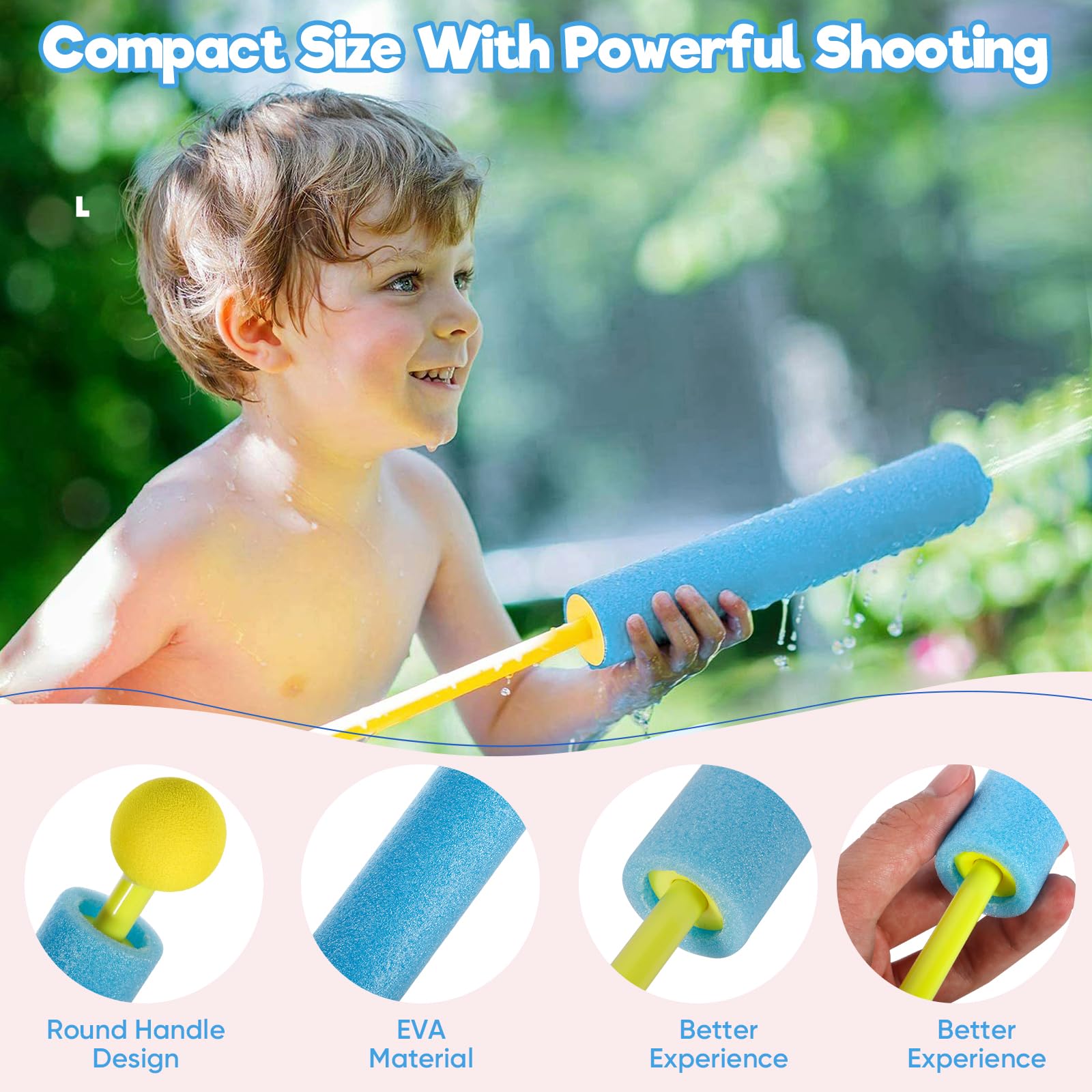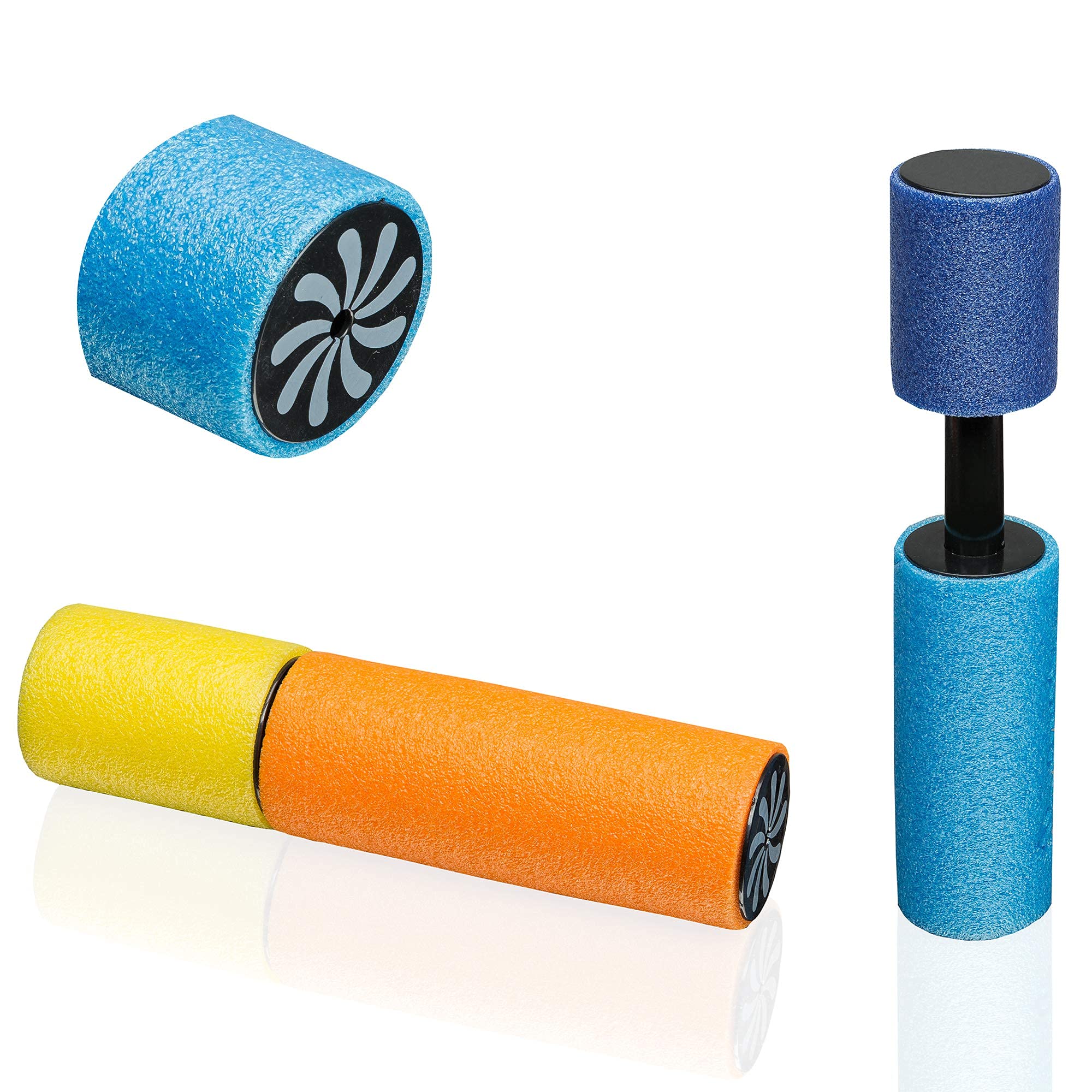 Besonders sicher: Die Pistolen sind mit weichem Schaumstoff ummantelt, verletzen nicht und schwimmen sogar auf dem Wasser. Aus ABS-Material und geruchlosem EVA für die Griffe - alles unbedenklich für Kinder.