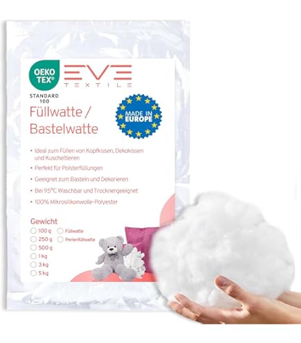 Hallo ihr Bastler und Heimwerker! Diese HEIMTEX Füllung aus 100% Polyester-Frischfasern ist genau das Richtige für alle deine Füll-Projekte! Mit 2000 g hast du genug Material für Kissen, Nackenkissen oder sogar zum Füllen von Babyspielzeug. Das besondere: Die Füllung ist OEKO TEX Standard 100 zertifiziert - also absolut unbedenklich und sicher, auch für Kinder und Allergiker! Die Fasern sind super flauschig, haben eine tolle Sprungkraft und bleiben auch nach langer Zeit noch schön voluminös. Und das beste: Du kannst die Füllung bei bis zu 95°C in der Waschmaschine waschen - praktisch für später, wenn die Kissen mal gereinigt werden müssen. Die Qualität ist echt hochwertig und strapazierfähig, dabei aber ganz weich und angenehm. Perfekt wenn du selbst Kissen nähen willst, alte Kissen auffrischen möchtest oder Spielzeug für die Kleinen selbst machen willst. Einfach die Füllung nach Bedarf entnehmen und in deine Projekte stopfen! Mit dieser Füllung machst du nichts falsch - qualitativ hochwertig, sicher und vielseitig einsetzbar. Auch toll für DIY-Projekte oder zum Ausstopfen von Sitzsäcken. Einfach bestellen und loslegen!