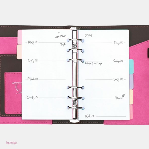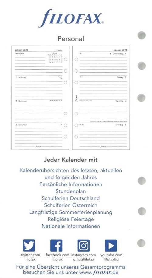 Hochwertige Kalendereinlage für deinen FILOFAX Organizer! Das Personal Format zeigt eine Woche auf zwei Seiten im schicken Cotton Creme Design. Perfekt für Termine, Notizen und Planungen. Deutsche Beschriftung - übersichtlich und praktisch. Robuste Qualität die lange hält. Einfach einsetzen und das Jahr 2024 optimal organisieren. Für alle, die Wert auf Ordnung und Stil legen!