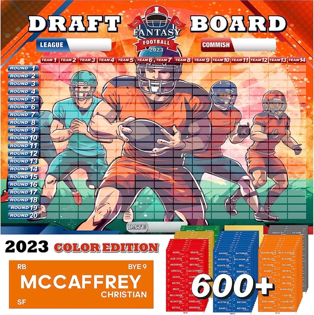 Bereit für die neue Fantasy Football Saison! Dieses Draft Kit enthält alles was du für deinen Draft brauchst. Mit 12-Team-Board (71,1x99,1 cm) und 468 farbcodierten Spieler-Etiketten. \\n\\nFeatures: \\n• Inklusive Rookies 2024 und aktueller Spieler-Bewegungen \\n• Matten Etiketten ohne Blendung \\n• Blanko-Etiketten für eigene Ergänzungen \\n• Link zu Player Updates bis Draft-Beginn \\n\\nPerfekt organisiert für QB, RB, WR, TE, K und Team Defenses. Ohne störende Grafiken - nur die wichtigen Infos: Name, Position, Team und Bye-Woche. Mach deinen Draft zum Event!