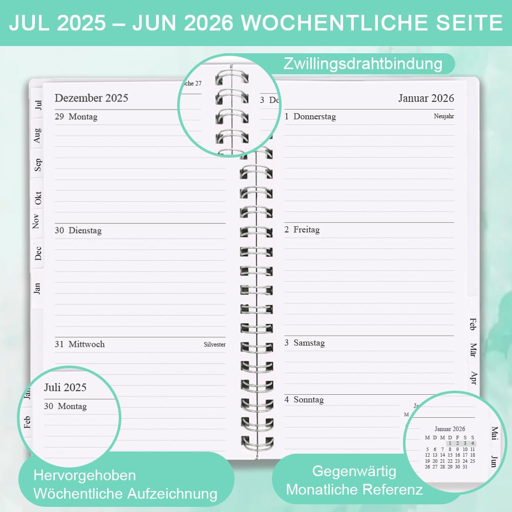 Perfekte Nachfüllpackung für deinen A6-Planer! Für den Zeitraum April 2025 bis Juni 2026 - ganze 15 Monate Übersicht. Größe: 9,7x17,3cm, 6-fach gelocht für Standard-Ringbücher. Aus 100g/m² dickem, säurefreiem Papier - keine Durchdrücker! Mit monatlichen Register-Tabs für schnelles Finden. Wochenansicht mit linierte Tagesplanung. Ideal für Termine, Aufgaben, Notizen. Tolles Geschenk für Schüler, Studenten oder Berufstätige. Organisiere deine Zeit effektiv!