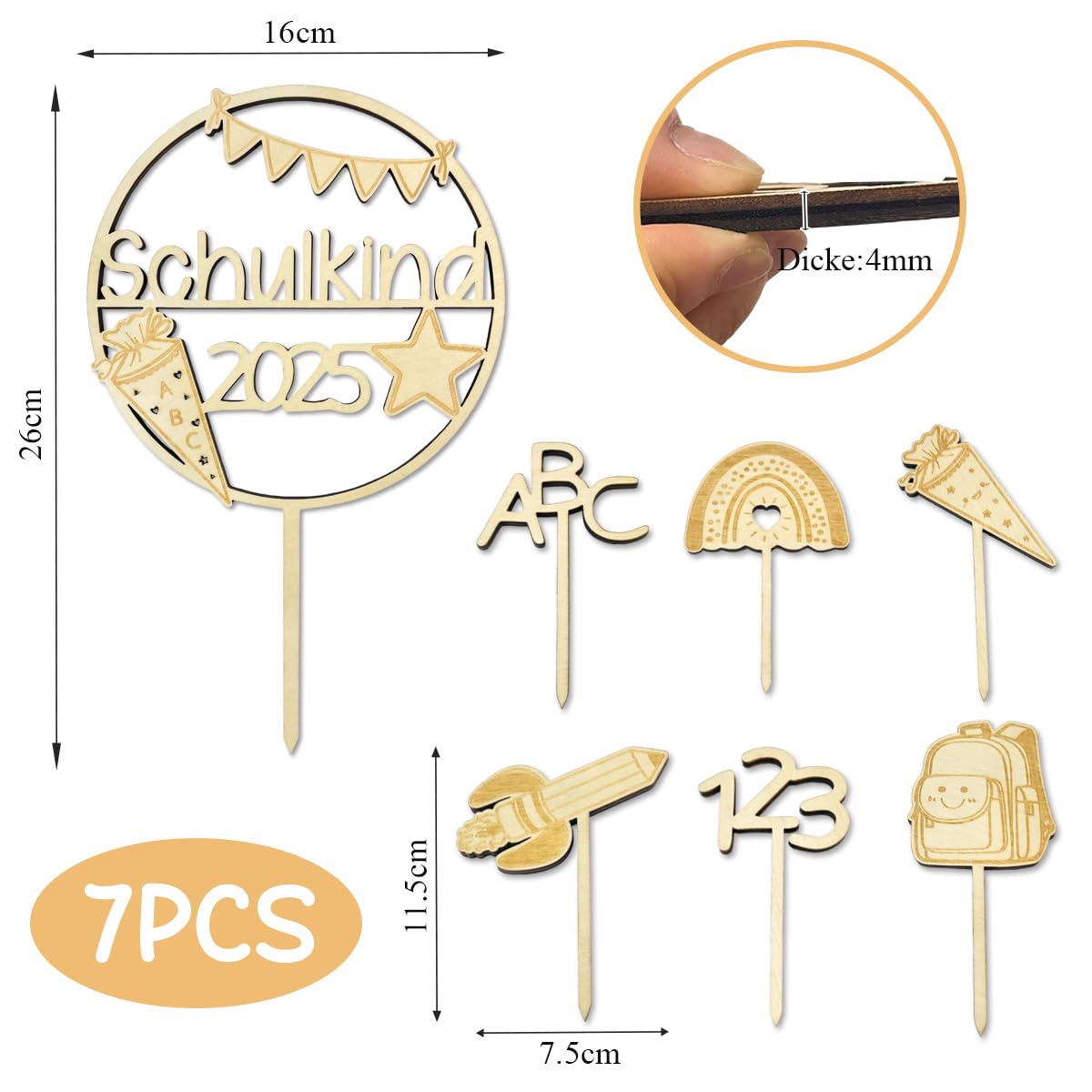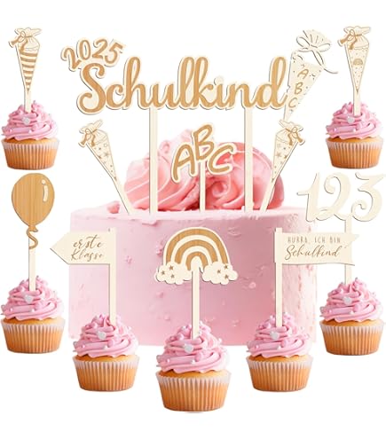 Hey, der erste Schultag ist was Besonderes - und mit dieser Deko wird die Torte zum absoluten Highlight! Das 7-teilige Set aus stabilem Holz enthält: einen großen 'Schulkind 2025' Topper plus sechs kleine Motive (ABC, 123, Regenbogen, Schultüten, Bleistift, Zuckertüte). Alles fein lasergraviert und super glatt - keine scharfen Kanten! Das natürliche Holz-Design ist neutral gehalten, passt also zu Jungen und Mädchen. Einfach in die Torte stecken und schon strahlt die ganze Feier. Umweltfreundlich und nachhaltig - kann auch nach der Party als Erinnerung aufbewahrt werden. Perfekt für Einschulungspartys, Schulanfangsfeiern oder einfach als süße Überraschung. Mach den großen Tag deines Kindes unvergesslich!