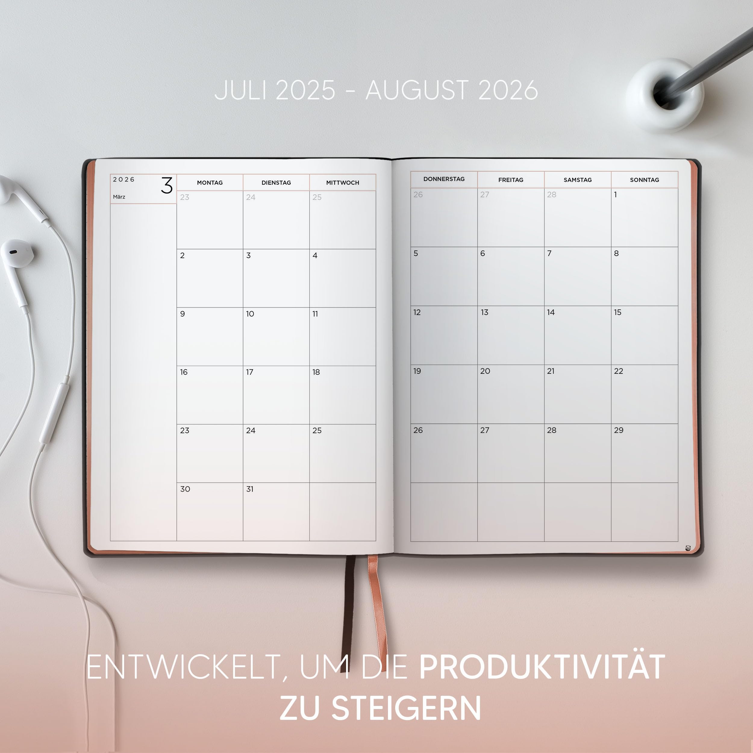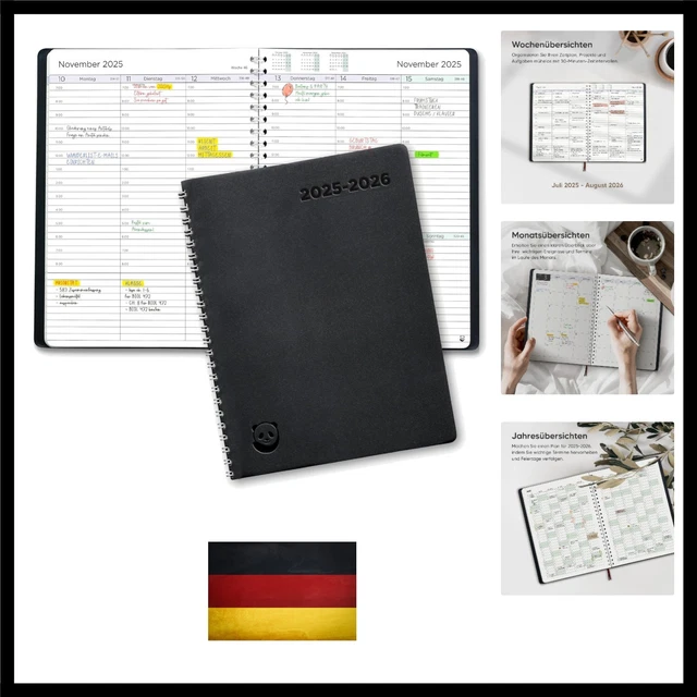 Endlich Ordnung im Chaos! Der Smart Panda Planer 2026 ist dein bester Freund fürs Zeitmanagement. A5 Format mit weichem veganem Leder-Einband - liegt super in der Hand. Wochenübersicht von Montag bis Sonntag mit 30-Minuten Intervallen von 7:00 bis 20:00 Uhr - perfekt für genaue Planung! Deckt 14 Monate ab (November 2025 bis Dezember 2026) mit Jahresübersichten, Monatsseiten und extra Notizseiten. Das 100g Papier ist super stabil - keine Tintenflecken mehr! Enthält deutsche Feiertage und ist ideal für Studenten, Lehrer oder einfach jeden, der sein Leben besser organisieren will. Einfacher als jede App und viel befriedigender! Hol dir diesen Planer und meistere 2026 wie ein Profi - deine Ziele warten!