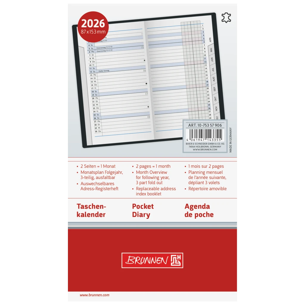 Schon an 2026 gedacht? Mit diesem praktischen BRUNNEN Taschenkalender bist du bestens vorbereitet! Das Modell 753 im handlichen A6 Format passt in jede Jackentasche und ist dein treuer Begleiter durchs ganze Jahr.