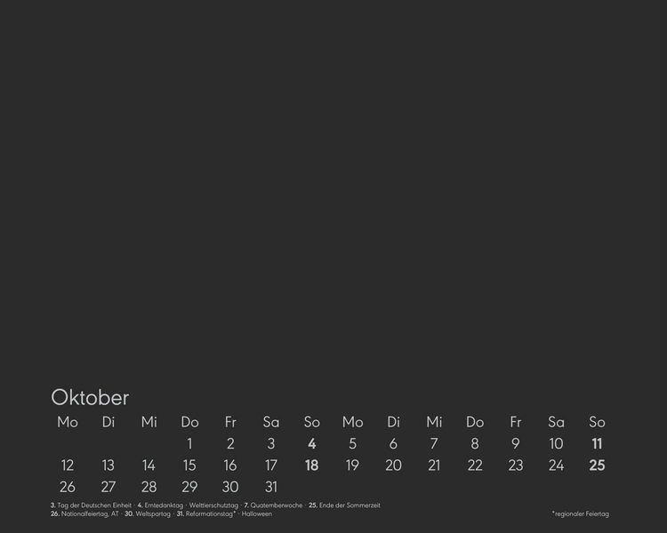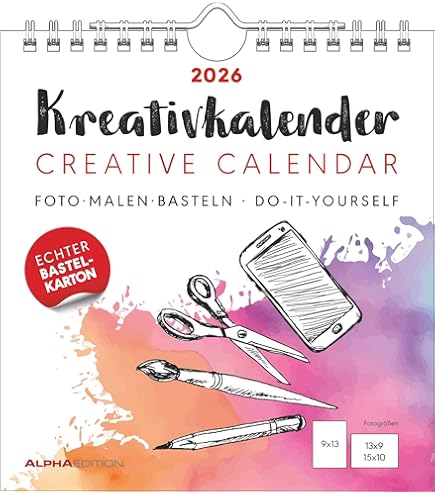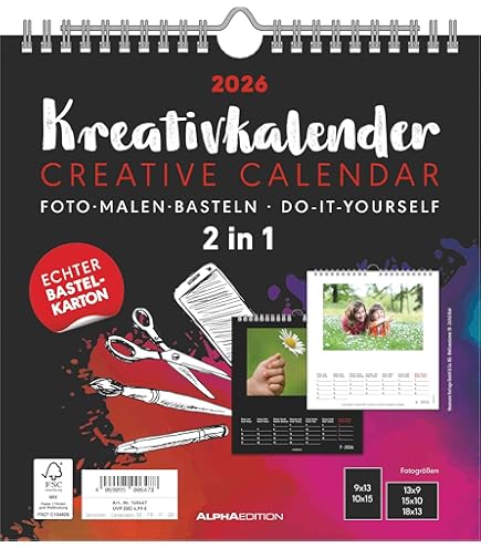Kreative Menschen, dieser Kalender ist eine Leinwand für eure Ideen! Der Alpha Edition Kreativ-Kalender für 2026 kommt im eleganten schwarzen Design mit weißer Schrift - der perfekte Hintergrund für deine Fotos, Zeichnungen oder Collagen. Mit 20x16cm ist er kompakt genug für jeden Schreibtisch, aber groß genug für tolle Gestaltungsideen. Du kannst ihn sowohl aufstellen als auch aufhängen - total flexibel! Das Kalendarium ist übersichtlich mit deutschen Feiertagen, aber dezent gehalten, damit deine Kunst im Vordergrund steht. Hergestellt in Deutschland aus FSC-zertifiziertem Papier mit stabiler Spiralbindung - Qualität, die sich sehen lassen kann. Perfekt fürs Büro, die Wohnung oder als ganz persönliches Geschenk. Ob Geburtstagsfotos, Urlaubserinnerungen oder einfach deine eigenen Kunstwerke - mit diesem Kalender wird jedes Jahr zu deinem persönlichen Kunstwerk. Einfach deine Kreativität ausleben und jeden Monat neu gestalten!