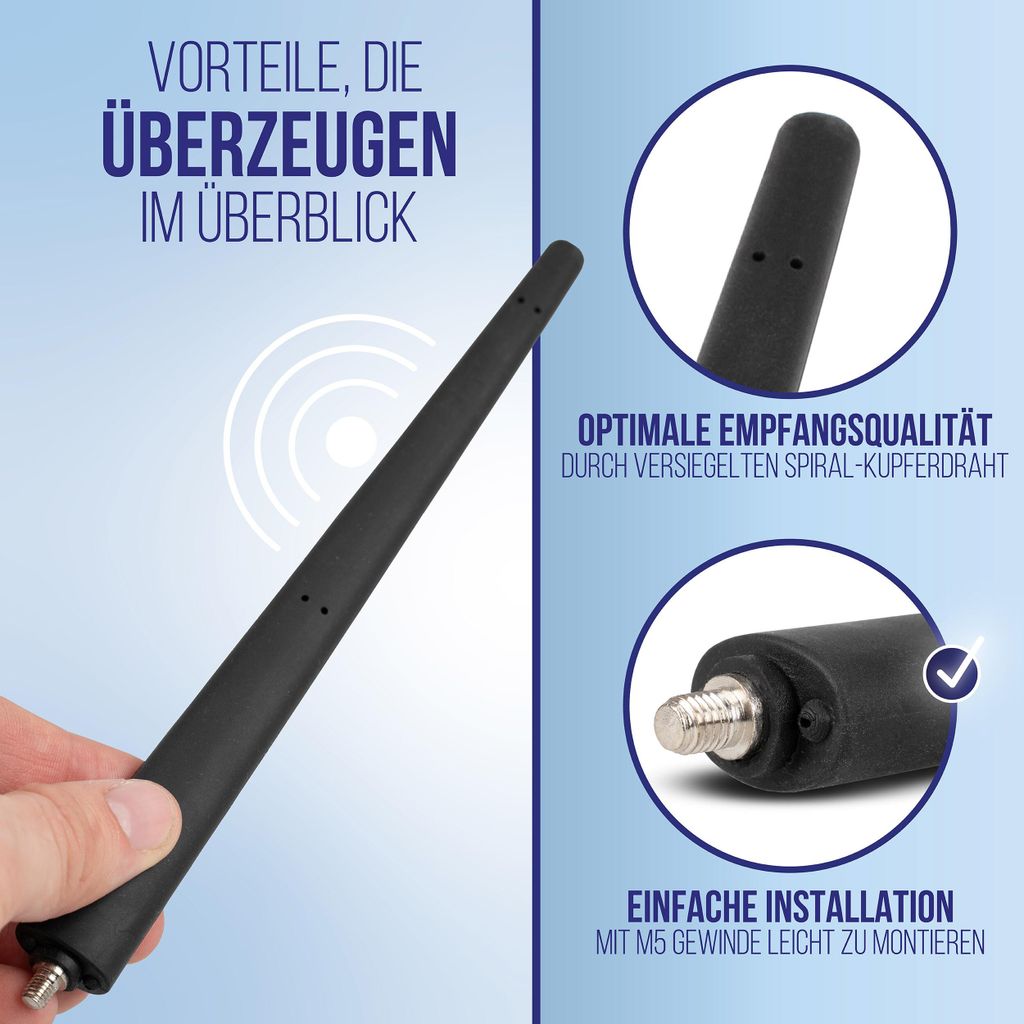 Deine Fiat-Antenne abgebrochen oder verloren? Diese alca Ersatzantenne mit 20cm Länge und ovalem Design fügt sich perfekt in dein Fahrzeug ein. Mit M5-Gewinde (5mm Durchmesser) passt sie für viele Fiat-Modelle - aber Vorsicht: Einige Fiats haben M6-Gewinde, also vorher unbedingt checken! Das schwarze TPE-E-Material ist wetterfest und UV-beständig, der innere Spiral-Kupferdraht sorgt für guten UKW/MW/DAB+ Empfang. Einfach das alte Gewinde abschrauben und diese Antenne aufdrehen - schon hast du wieder klaren Radioempfang! Die Antenne ist dezent im Design und hält auch bei schneller Fahrt sicher. Falls du unsicher bist, welches Gewinde dein Fiat hat, frag am besten beim Händler nach oder kontaktiere uns. So einfach kann Antennen-Ersatz sein!